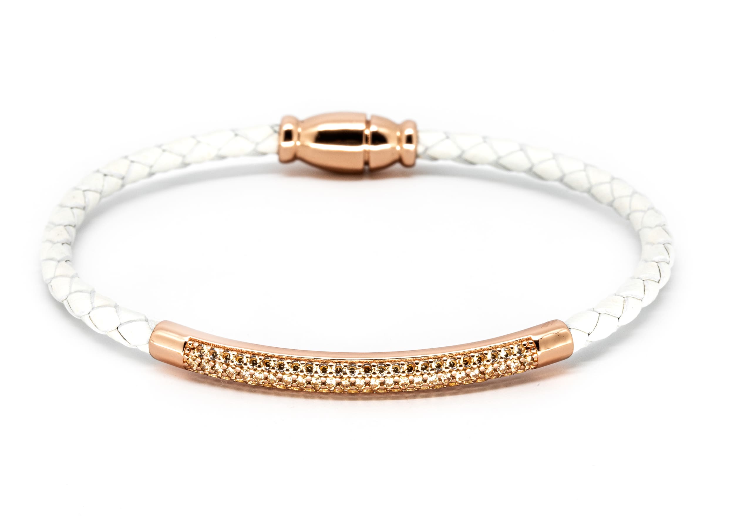 Bracciale con cinturino in cuoio intrecciato bianco e barretta centrale impreziosita da un brillante pavè in zirconia cubica champagne, realizzato in argento 925 con galvanica rodio rosa.