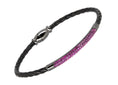 Bracciale con cinturino in cuoio intrecciato nero e barretta centrale impreziosita da un brillante pavè in rubino sintetico, realizzato in argento 925 con galvanica rodio nero.