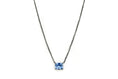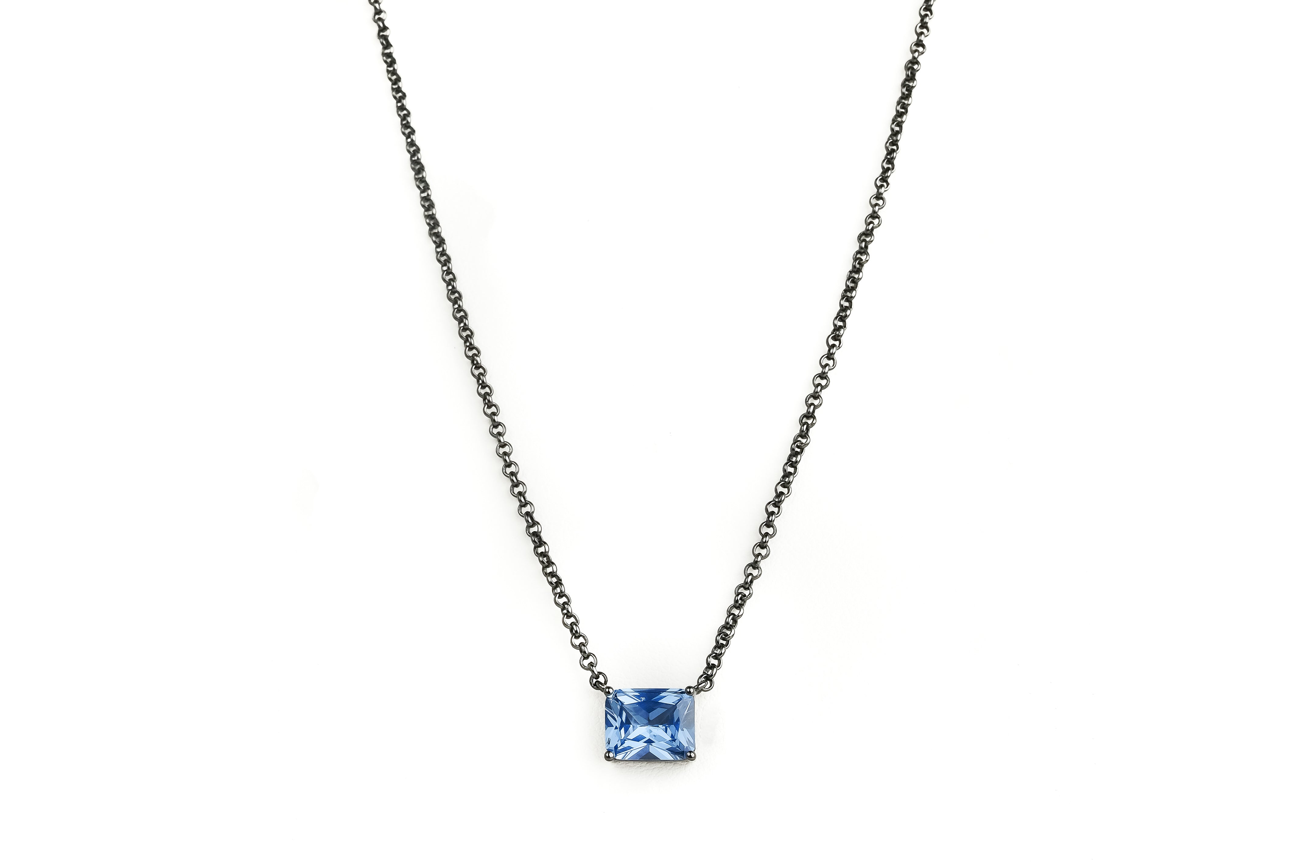 Collana con baguette pendente in spinello sintetico azzurro, realizzata in argento 925 con galvanica rodio nero.