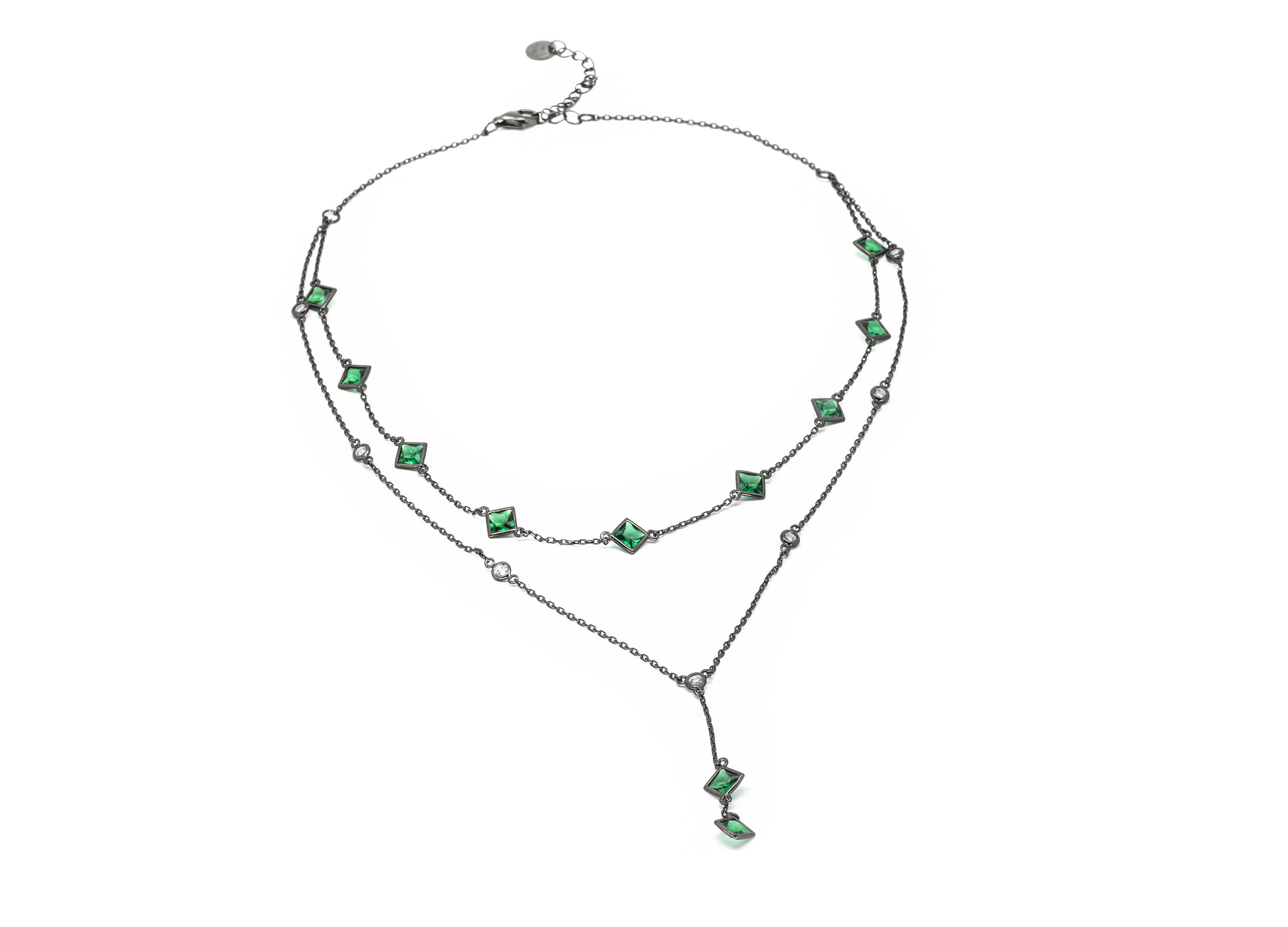 Collana doppia con pietre taglio carrè in nano crystal verde e tonde in zirconia cubica bianca, realizzata in argento 925 con galvanica rodio nero.