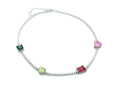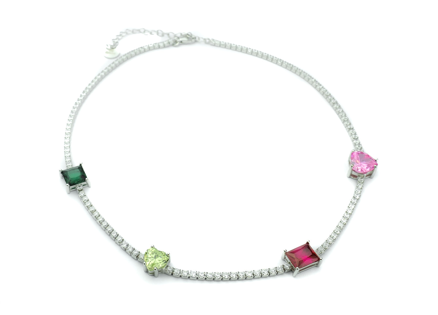 Girocollo tennis con pietre taglio carrè, cuori e baguettes con zirconia cubica bianca, verde, rosa, rubino sintetico e nano crystal verde, realizzato in argento 925 con galvanica rodio bianco.