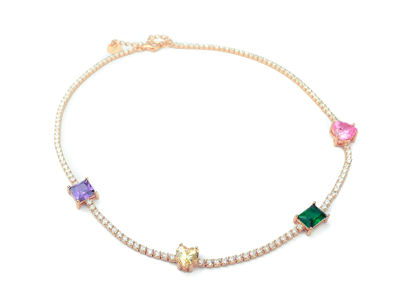 Girocollo tennis con pietre taglio carrè, cuori e baguettes con zirconia cubica bianca, ametista, rosa, champagne e nano crystal verde, realizzato in argento 925 con galvanica rodio rosa.