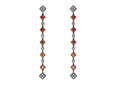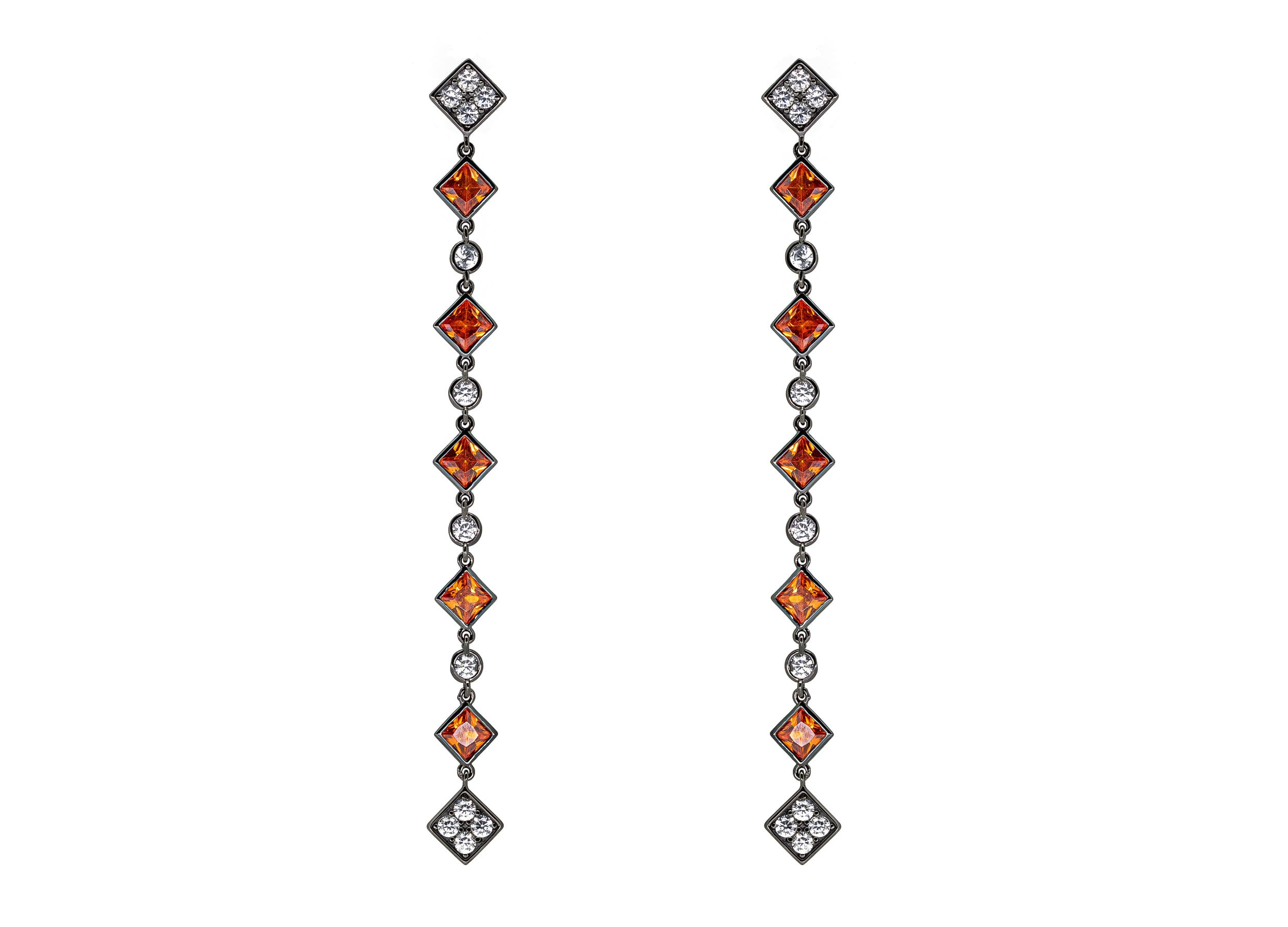 Orecchini pendenti con pietre taglio carrè e tondi in zirconia cubica arancio e bianca, realizzati in Argento 925 con galvanica rodio nero ad alta resistenza.