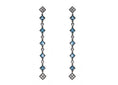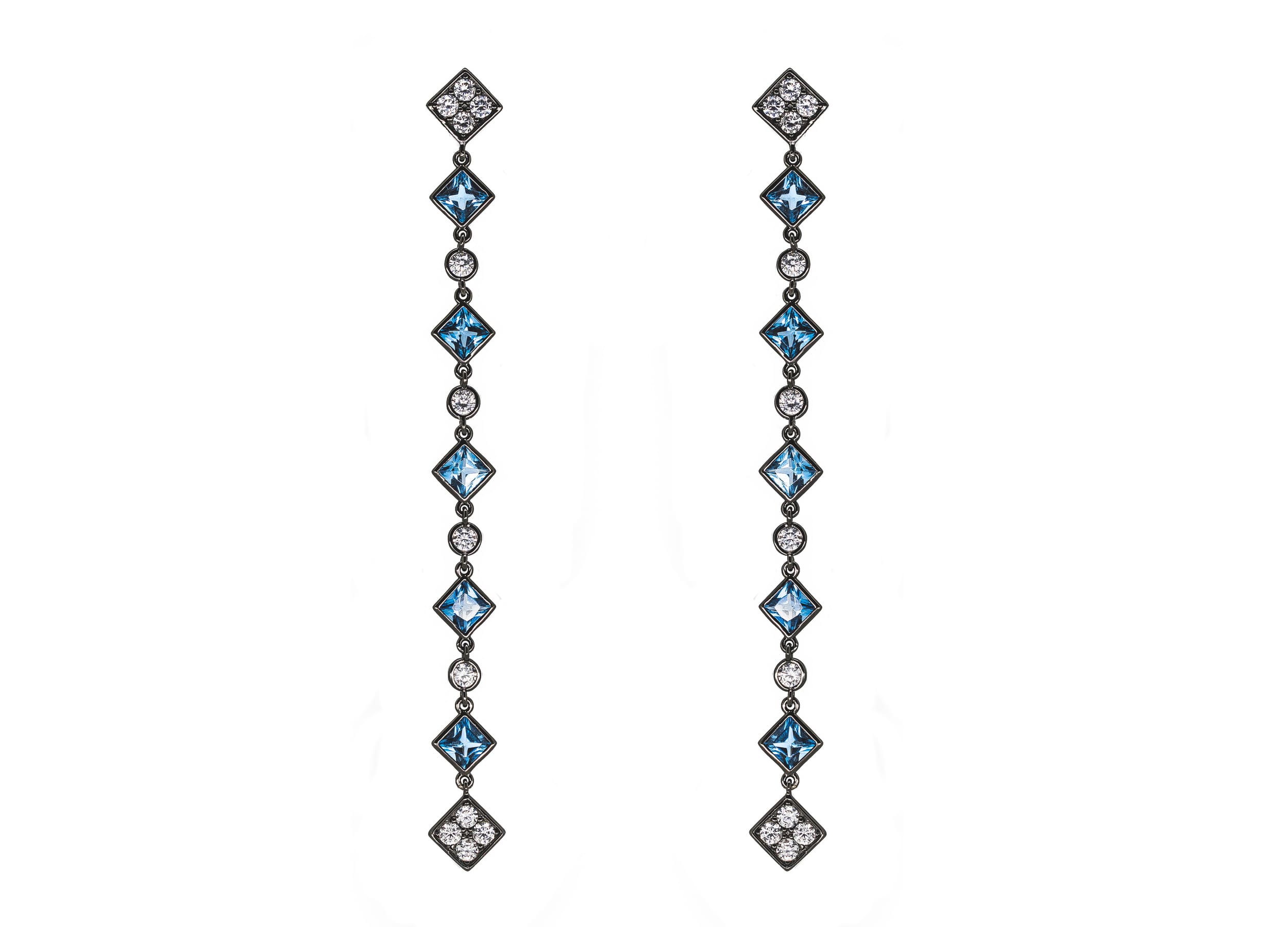 Orecchini pendenti con pietre taglio carrè in spinello sintetico azzurro e tondi in zirconia cubica bianca, realizzati in Argento 925 con galvanica rodio nero ad alta resistenza.