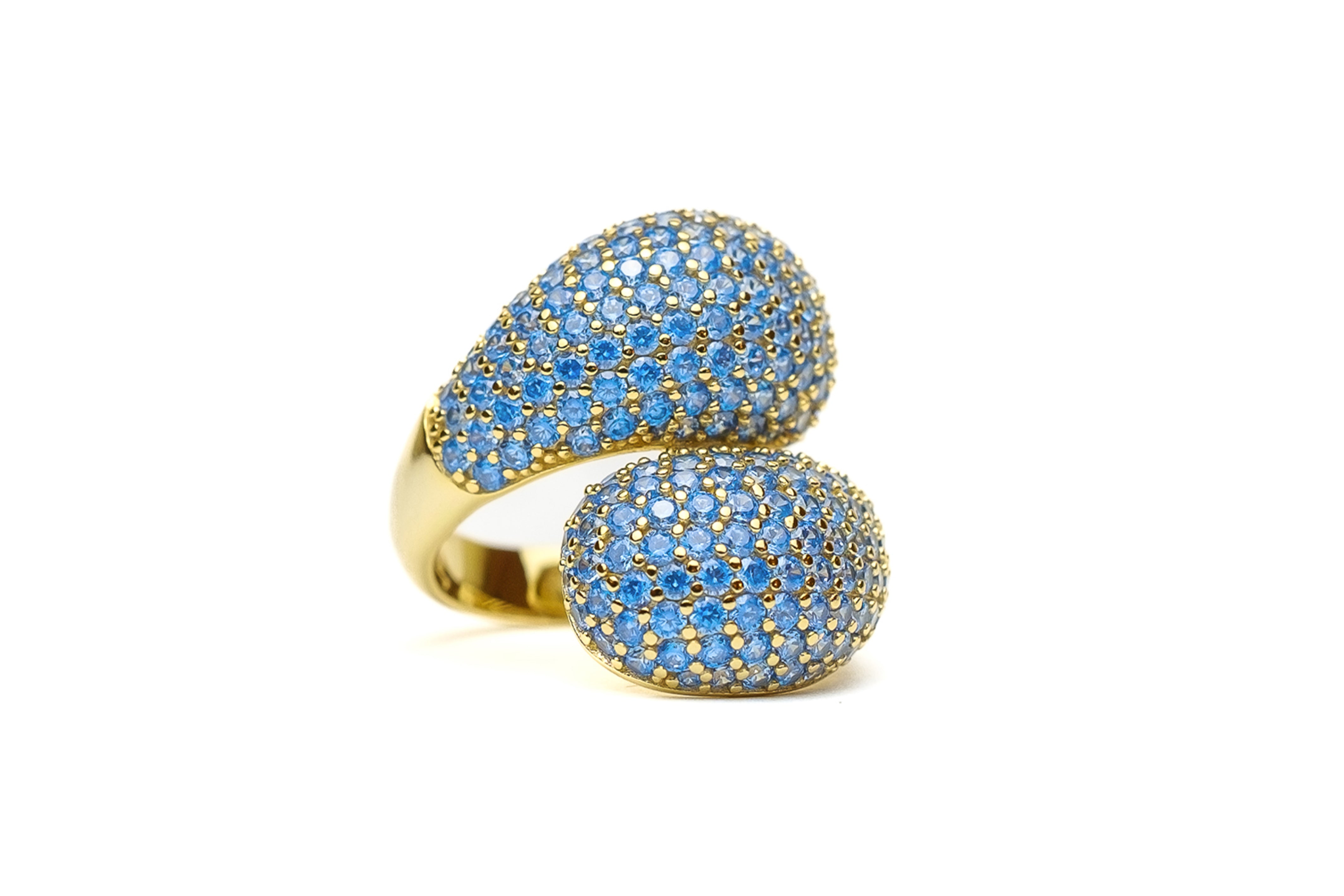 Anello contrarier bombato realizzato in argento 925 con galvanica rodio giallo impreziosito da un coloratissimo pavè in zirconia cubica aqua blue.