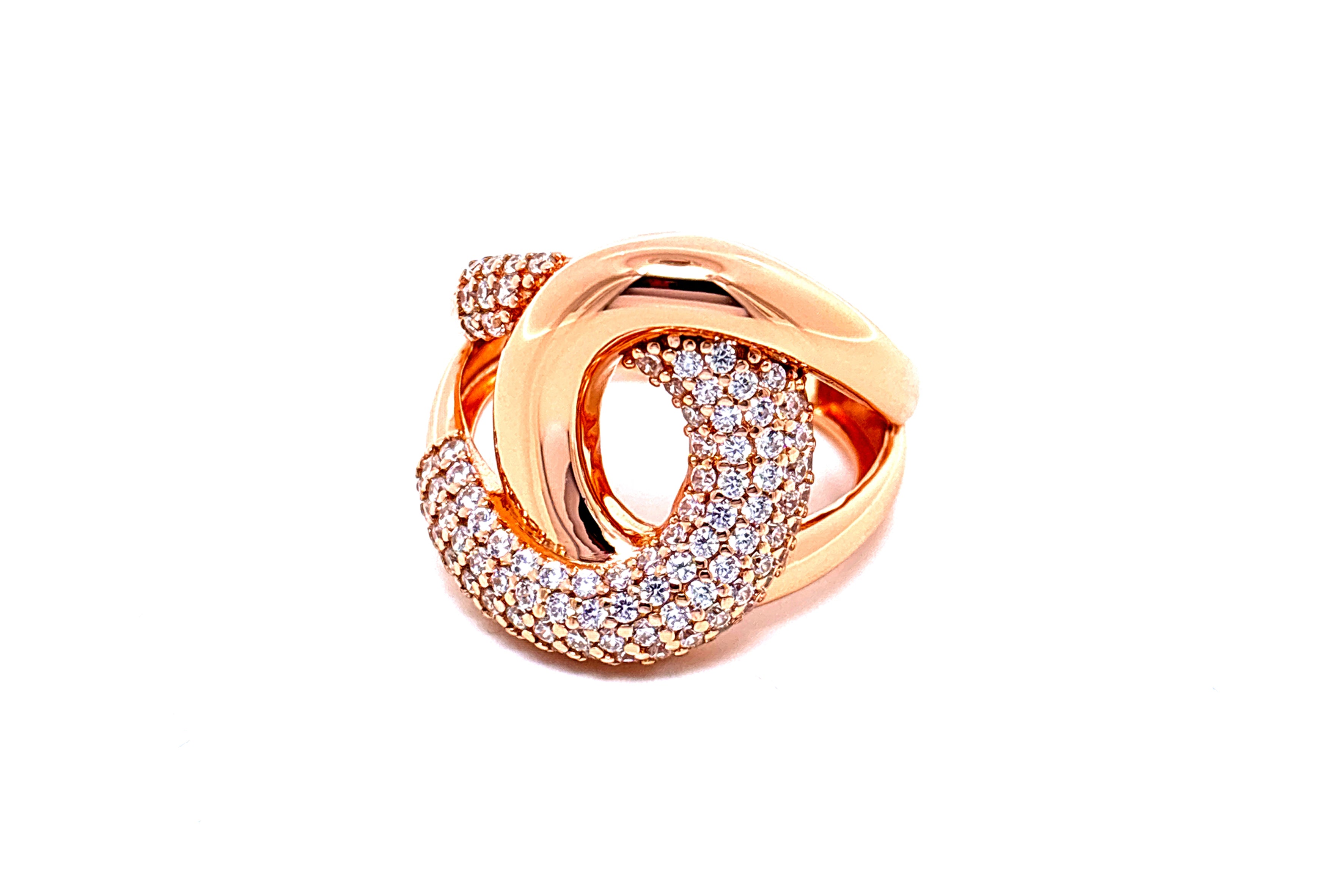 Anello doppio cerchio intrecciato, metà pavè in zirconia cubica bianca, realizzato in argento 925 con galvanica rodio rosa ad alta resistenza.