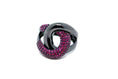 Anello doppio cerchio intrecciato, metà pavè in rubino sintetico, realizzato in argento 925 con galvanica rodio nero ad alta resistenza.