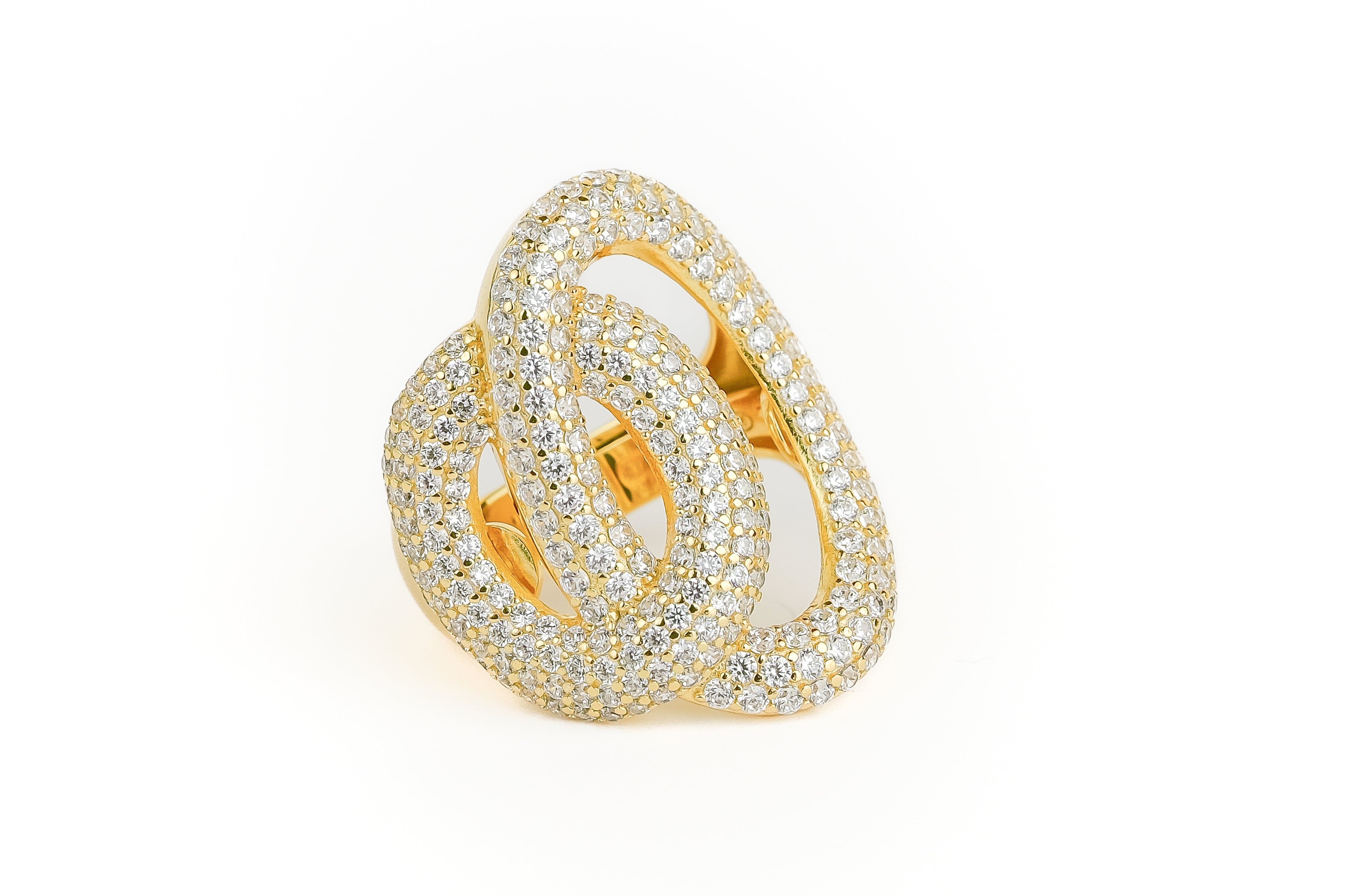 Anello con due ovali intrecciati, realizzato in argento 925 con galvanica rodio giallo e impreziosito da un brillante pavè in zirconia cubica bianca.