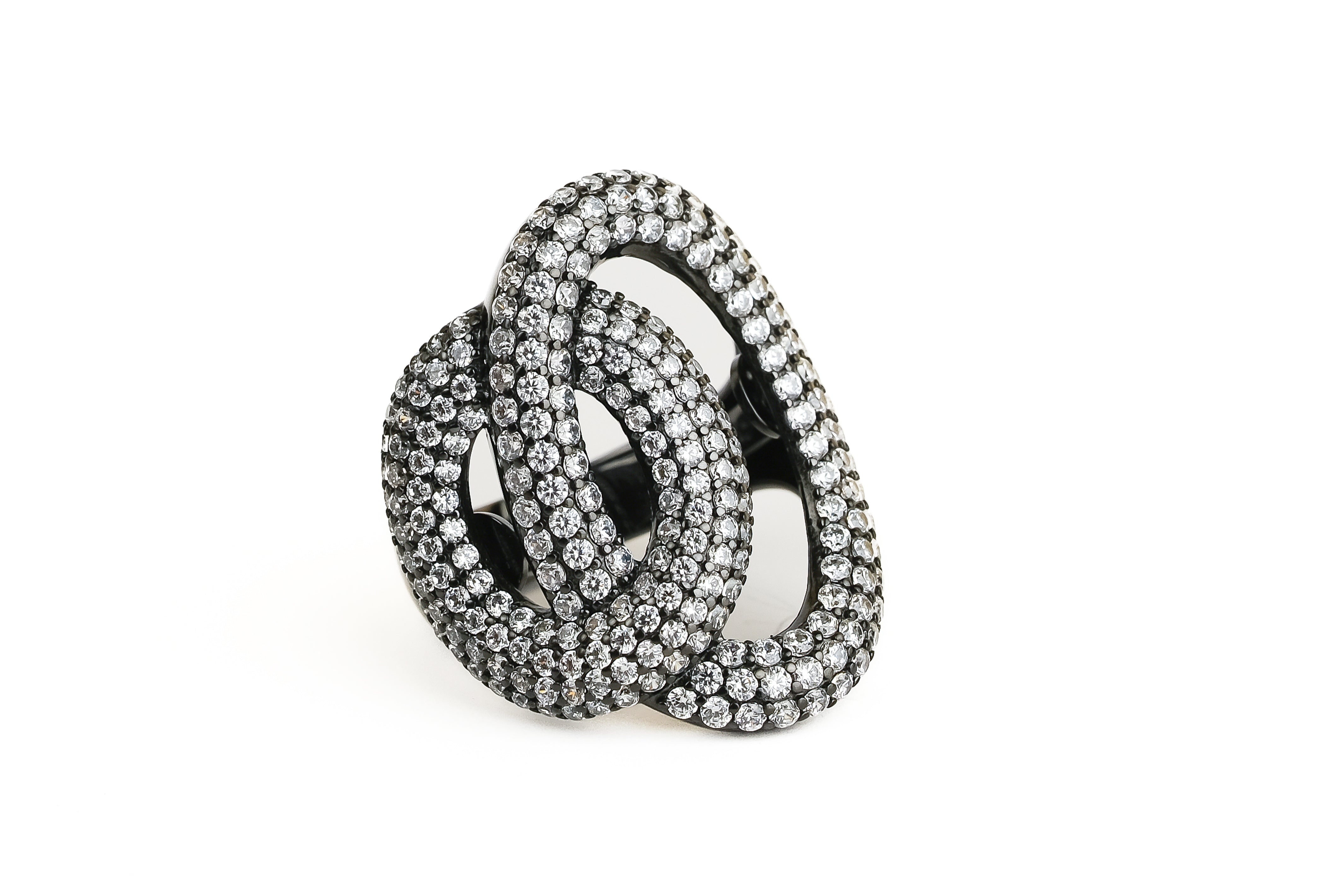 Anello con due ovali intrecciati, realizzato in argento 925 con galvanica rodio nero e impreziosito da un brillante pavè in zirconia cubica bianca.