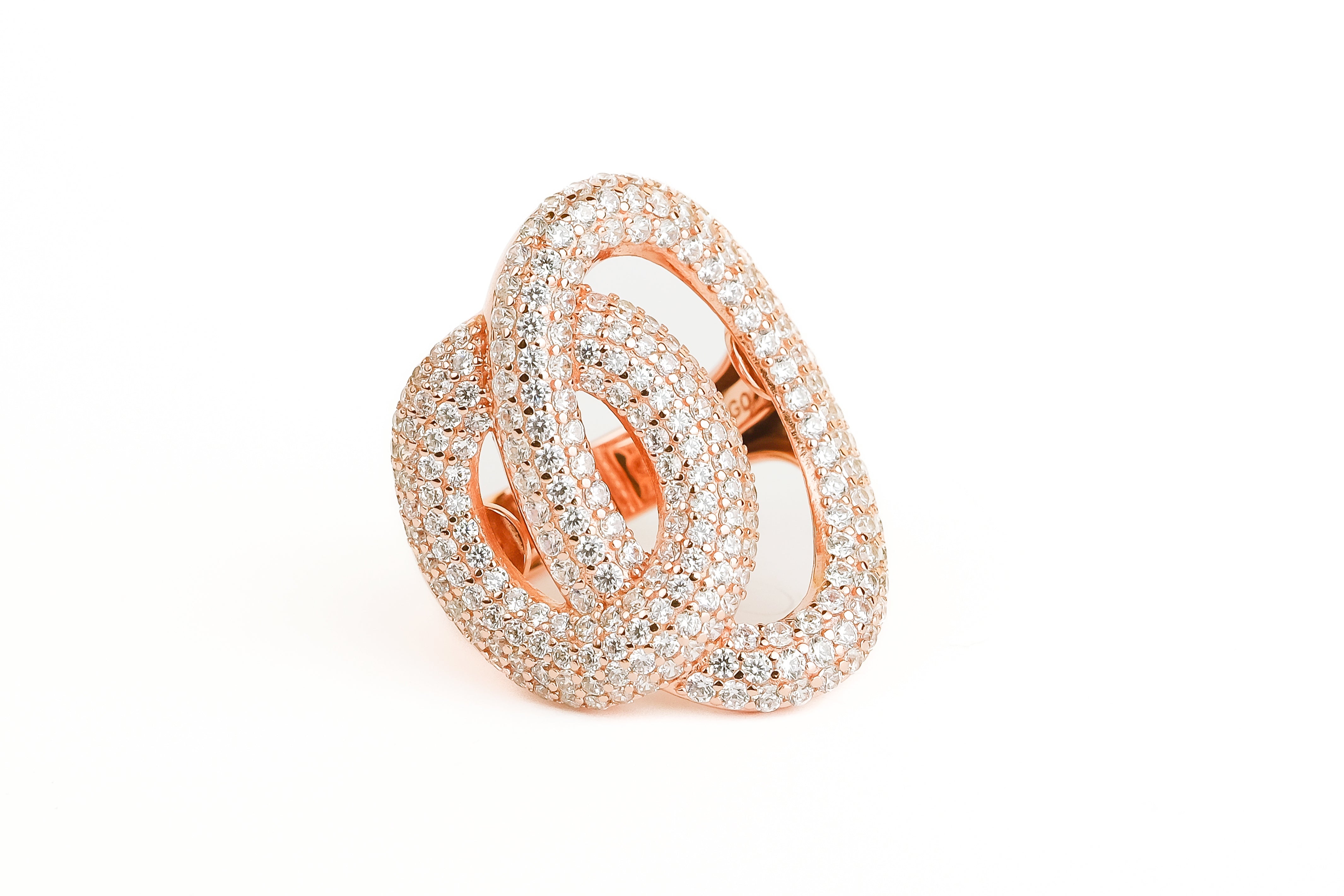 Anello con due ovali intrecciati, realizzato in argento 925 con galvanica rodio rosa e impreziosito da un brillante pavè in zirconia cubica bianca.