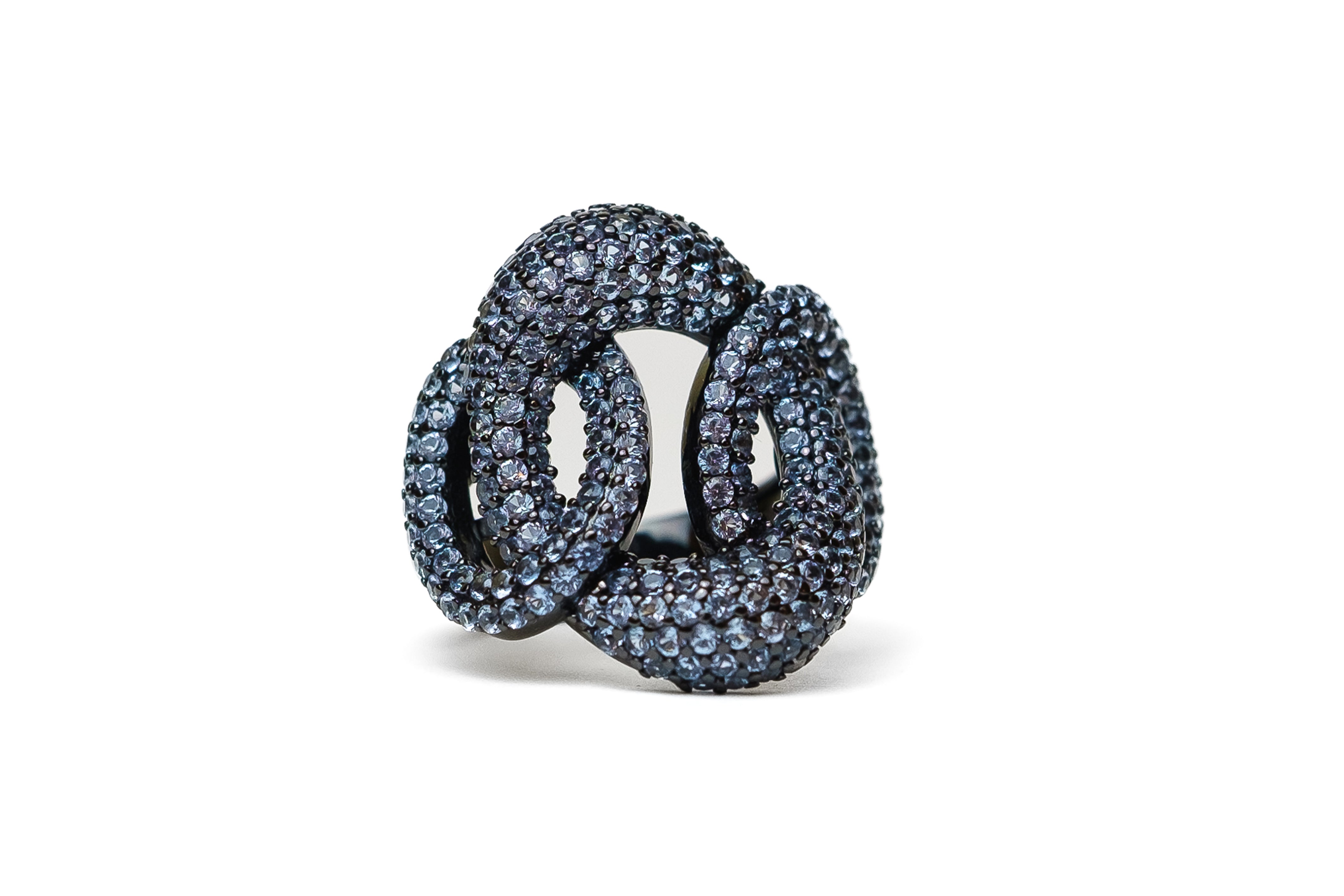 Anello groumettes grande con tre ovali intrecciati, realizzato in argento 925 con galvanica rodio nero e impreziosito da un brillante pavè in spinello sintetico azzurro.
