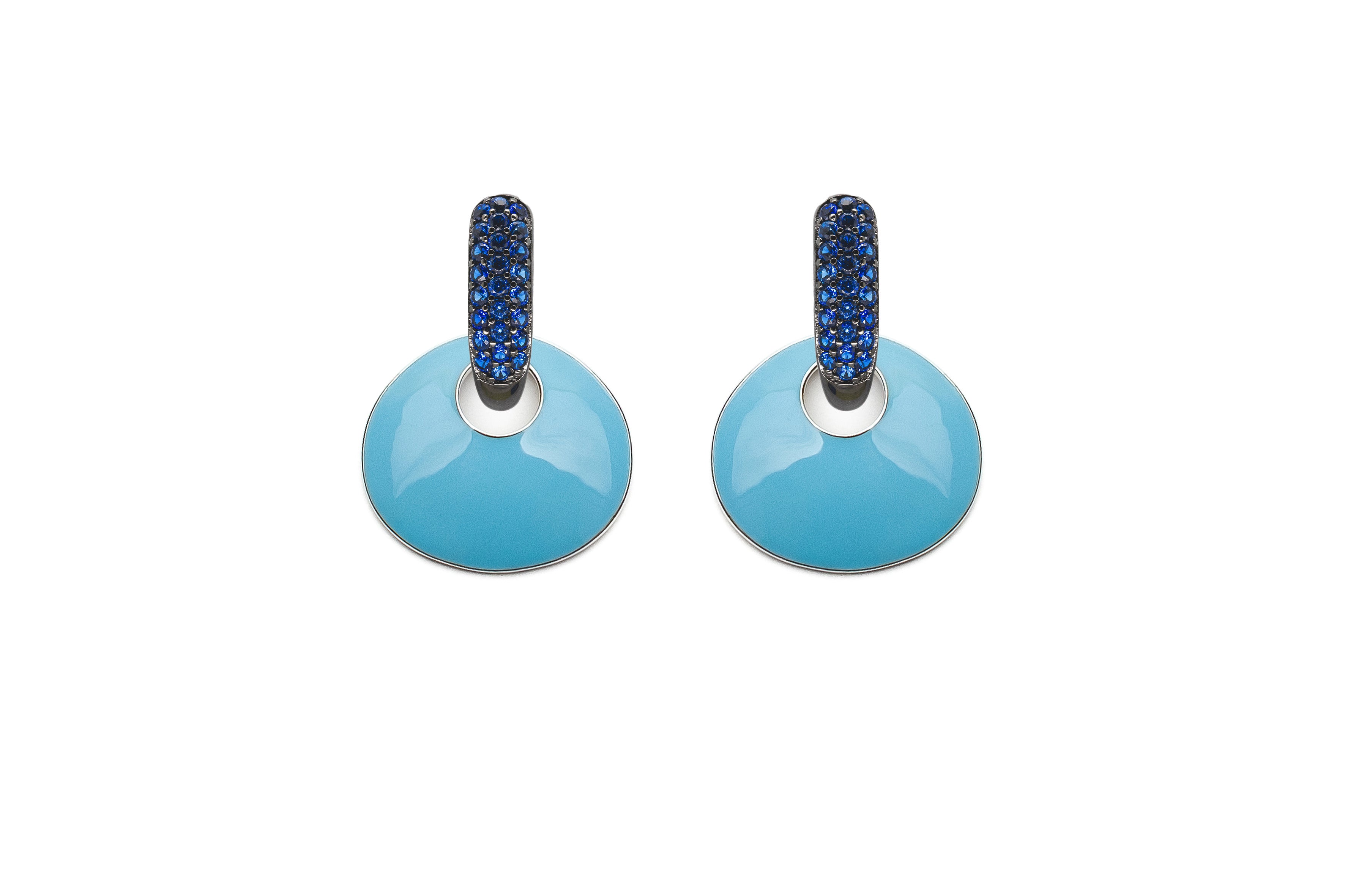 Componenti per orecchini componibili con smaltatura a freddo in azzurro e galvanica rodio bianco ad alta resistenza.