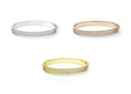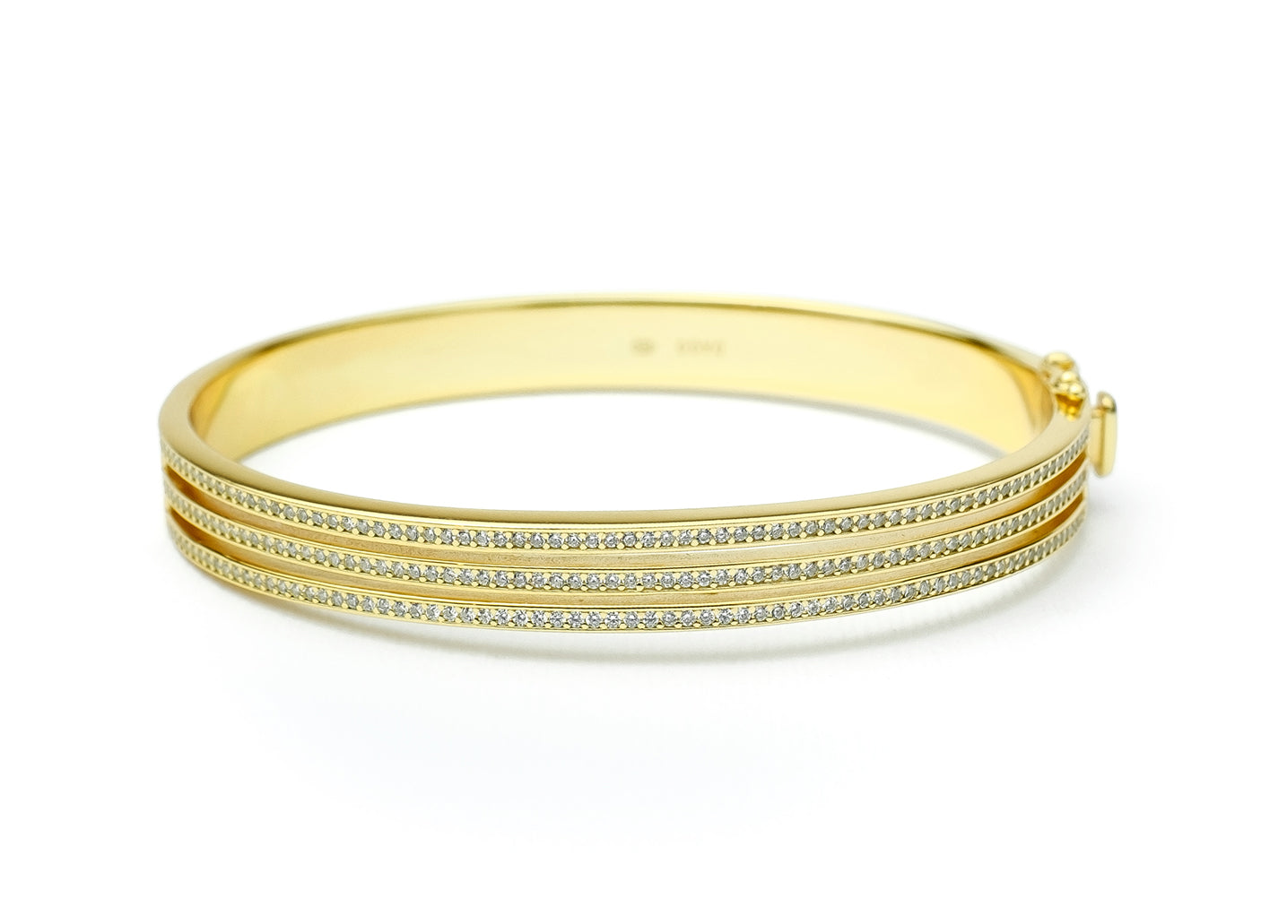Bracciale rigido a manetta con tre canali incassati con pietre tonde in zirconia cubica bianca, realizzato in Argento 925 con galvanica rodio giallo.