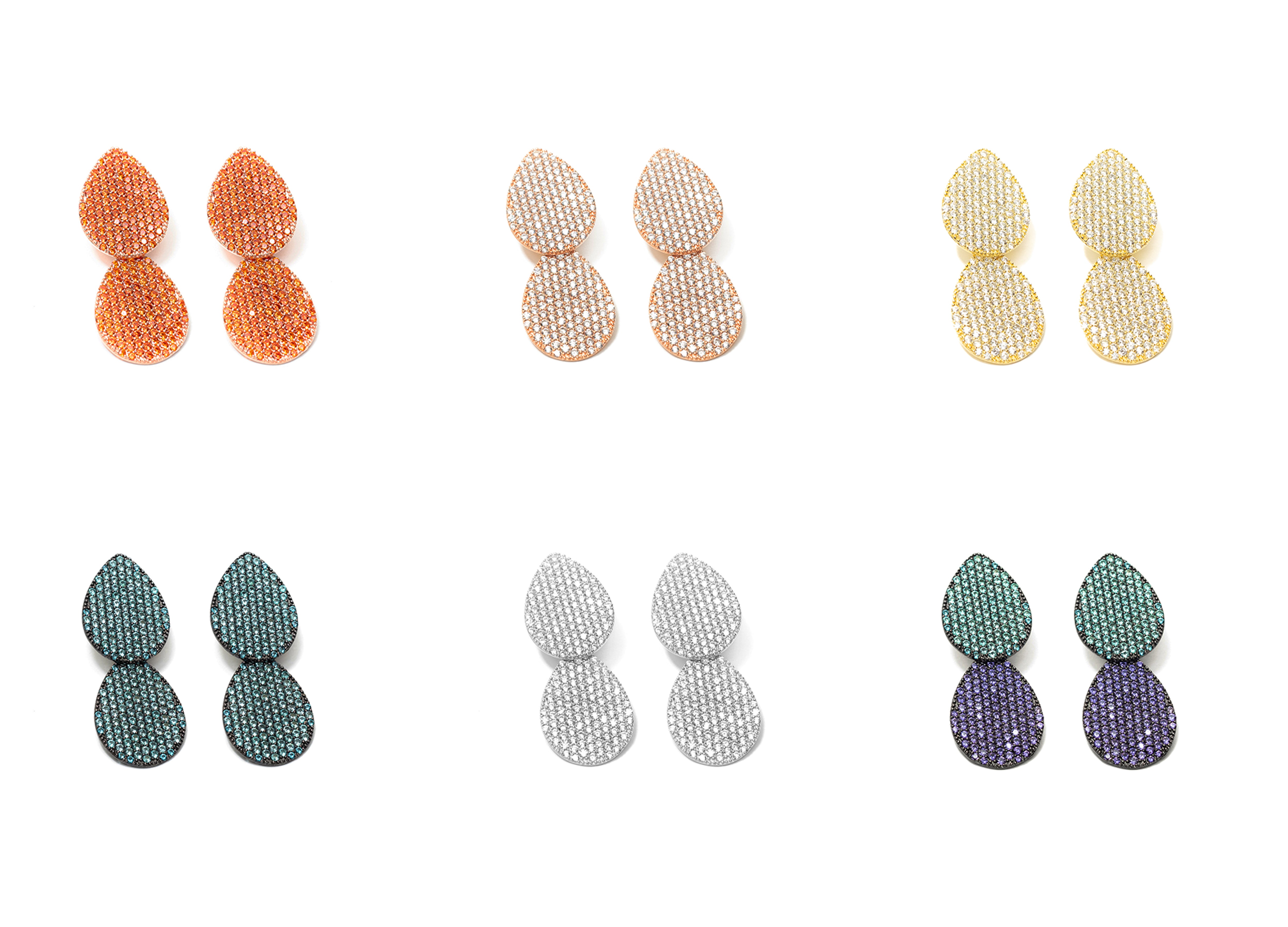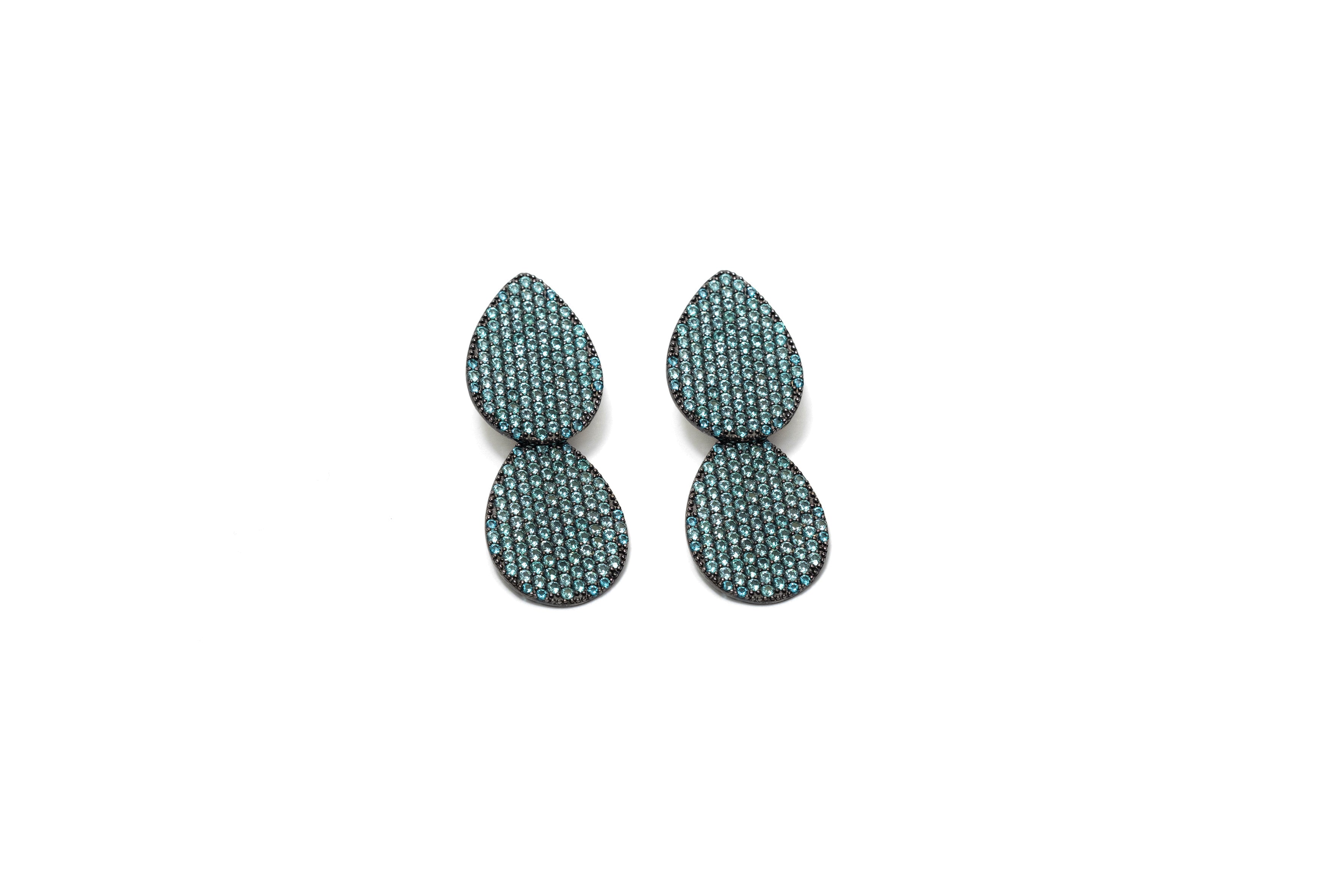 Orecchini due gocce pendenti, con pavè in nano crystal verde paraiba, realizzati in Argento 925 con galvanica rodio nero.
