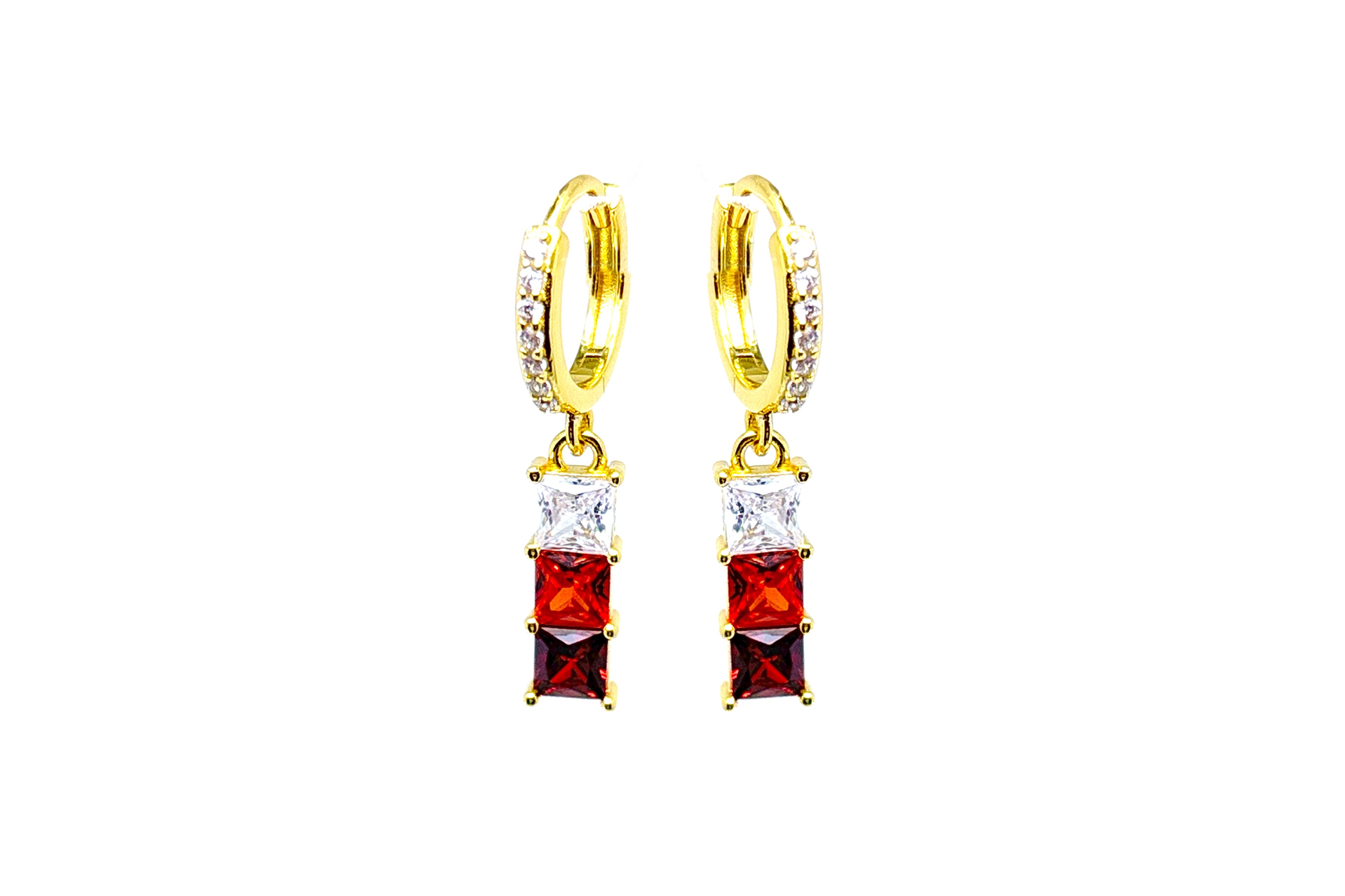 Orecchini a cerchietto incassato con zirconia cubica bianca e pendente 3 pietre taglio carrè in zirconia cubica bianca, arancio e granato, realizzati in Argento 925 con galvanica rodio giallo.