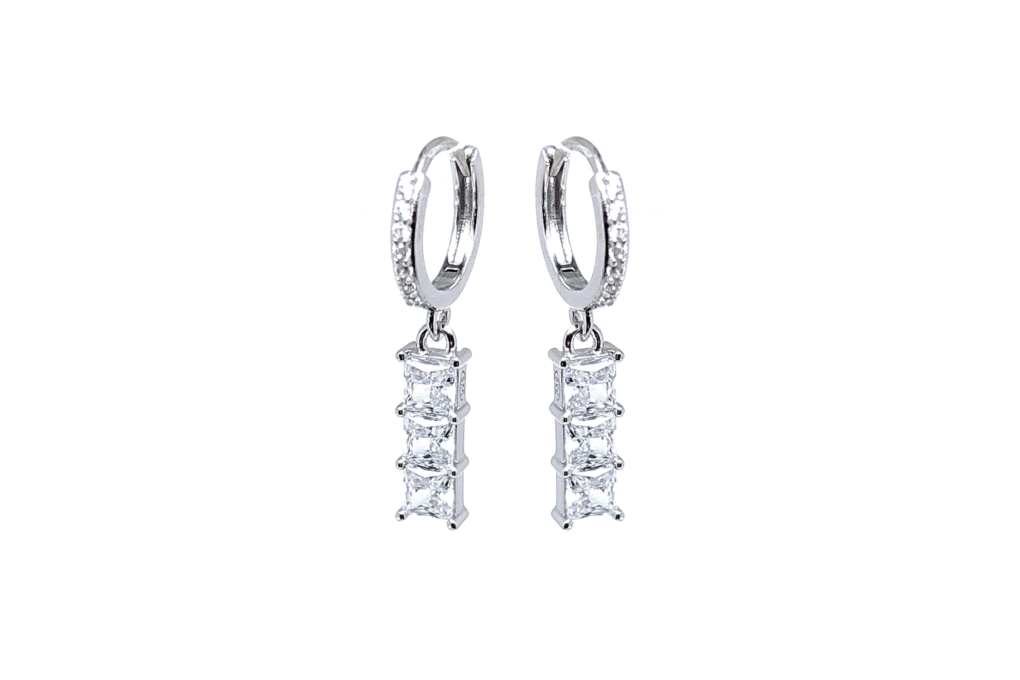 Orecchini a cerchietto incassato e pendente 3 pietre taglio carrè in zirconia cubica bianca, realizzati in Argento 925 con galvanica rodio bianco.