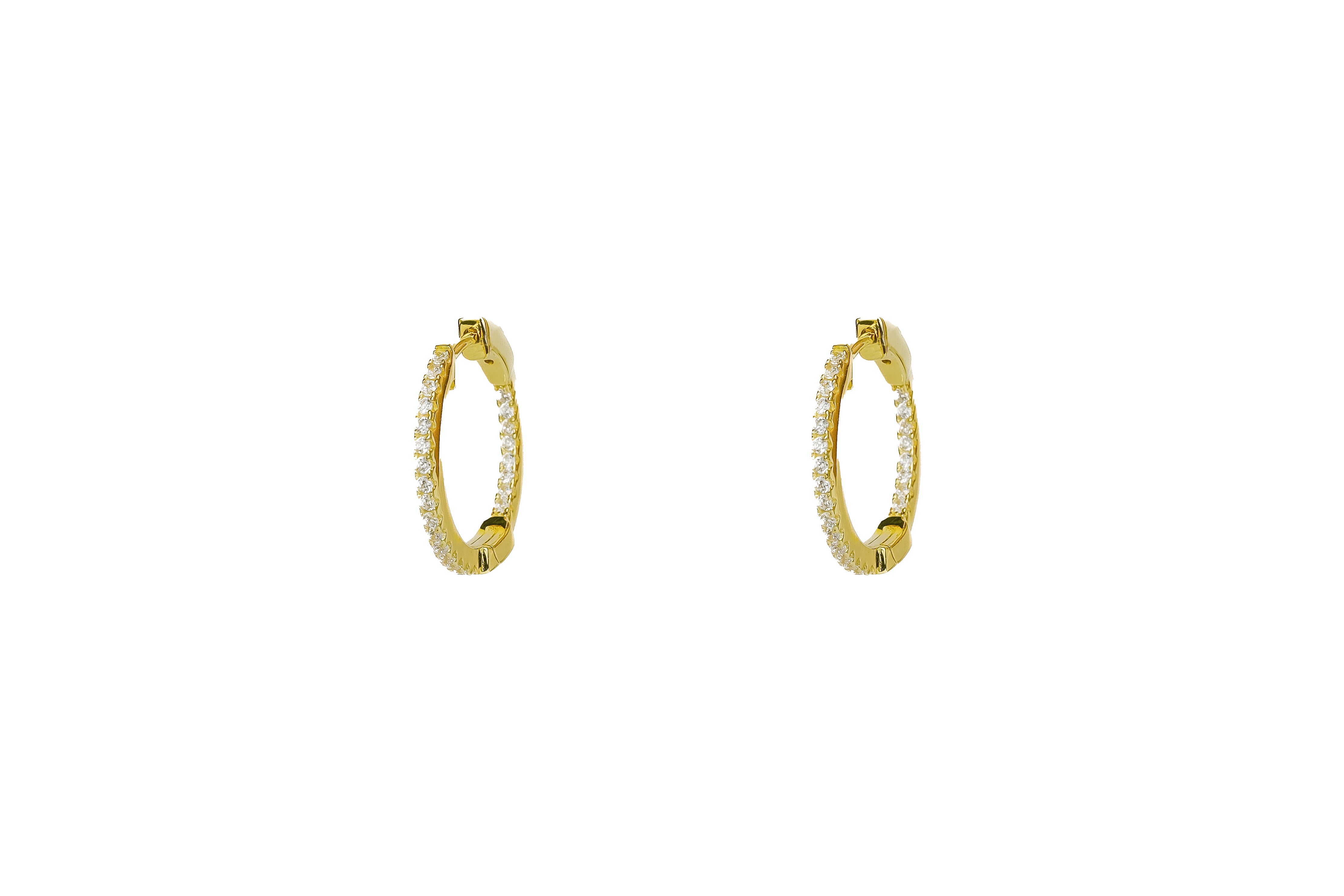 Orecchini a cerchio piccolo con incassatura frontale e interna in zirconia cubica bianca, realizzati in Argento 925 con galvanica rodio giallo ad alta resistenza.