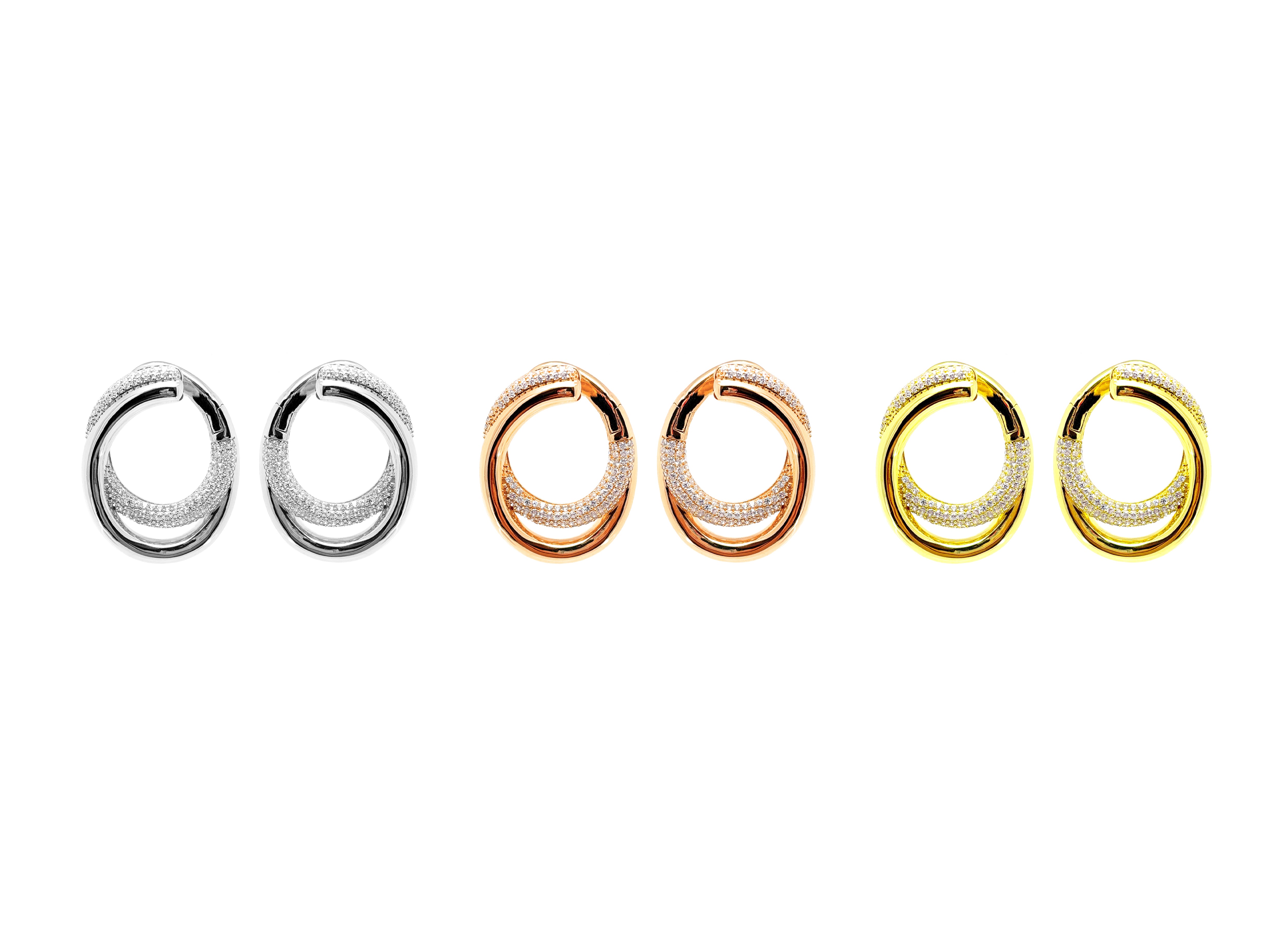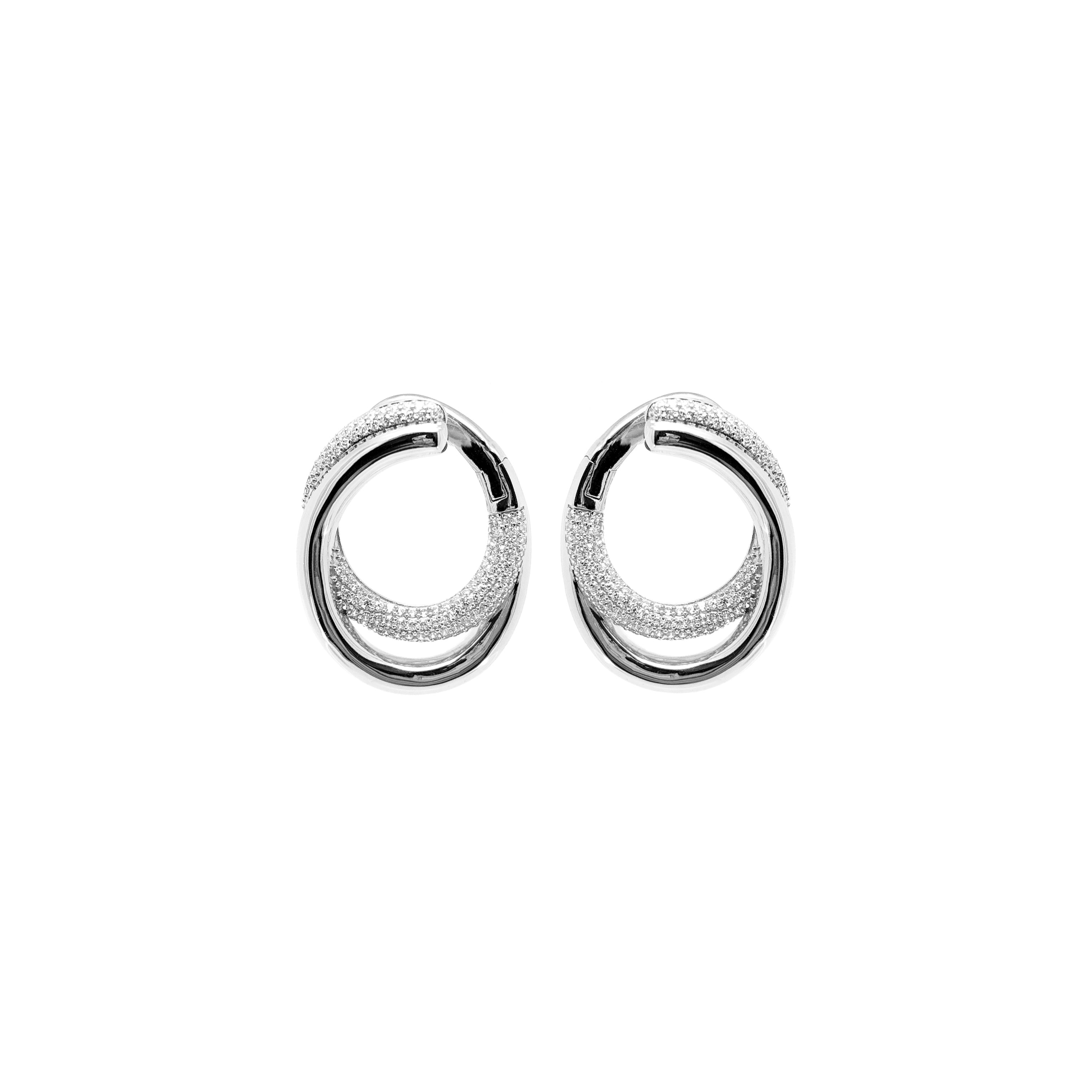 Orecchini stile "Creole" forma ovale doppia, metà liscio e metà con pavè in zirconia cubica bianca, realizzati in Argento 925 con galvanica rodio bianco.