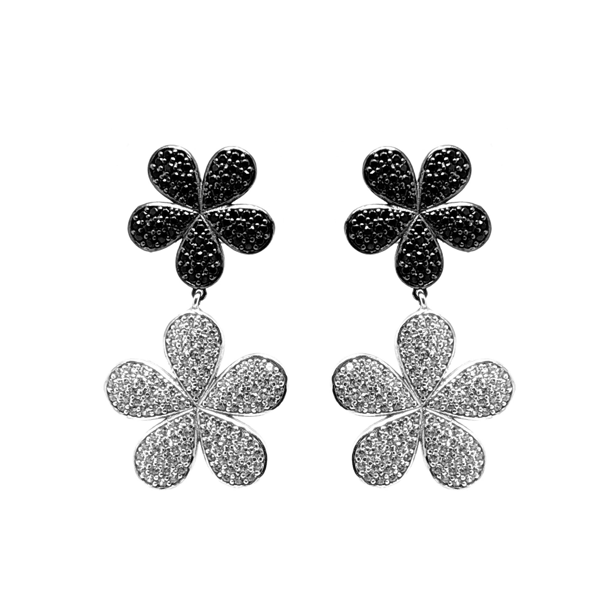 Orecchini due margherite pendenti, con pavè bicolore in nano crystal nero e zirconia cubica bianca, realizzati in Argento 925 con galvanica rodio nero e bianco.