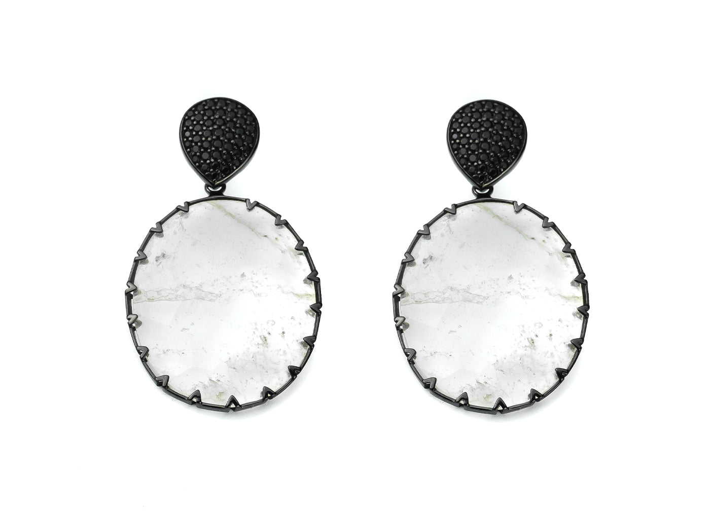 Orecchini pendenti con pavè in nano crystal nero e doppietta ovale in cristallo di rocca craccato, realizzati in argento 925 con galvanica rodio nero.