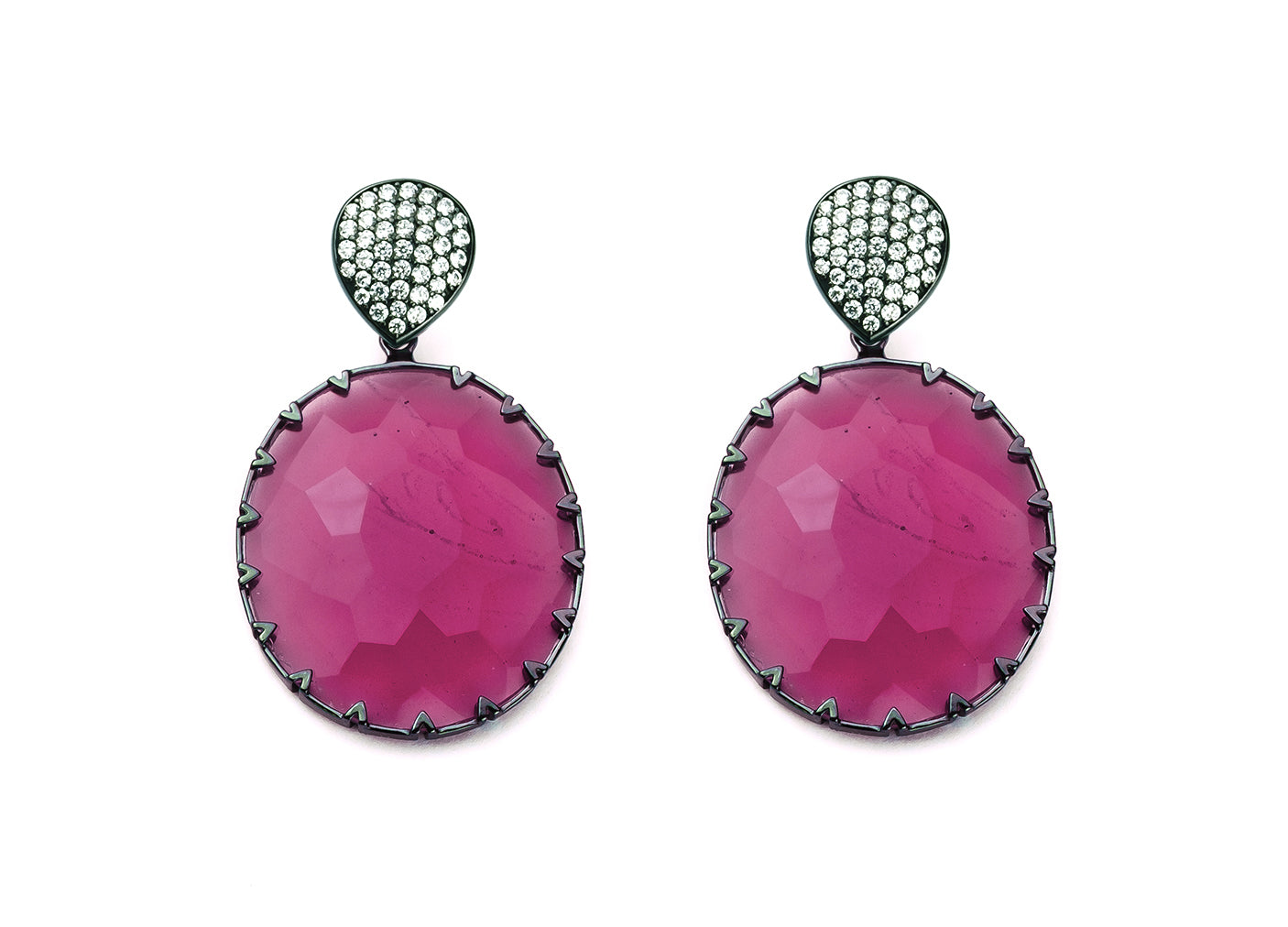 Orecchini pendenti con pavè in zirconia cubica bianca e doppietta ovale in cristallo di rocca craccato e cristallo fuxia, realizzati in argento 925 con galvanica rodio nero.