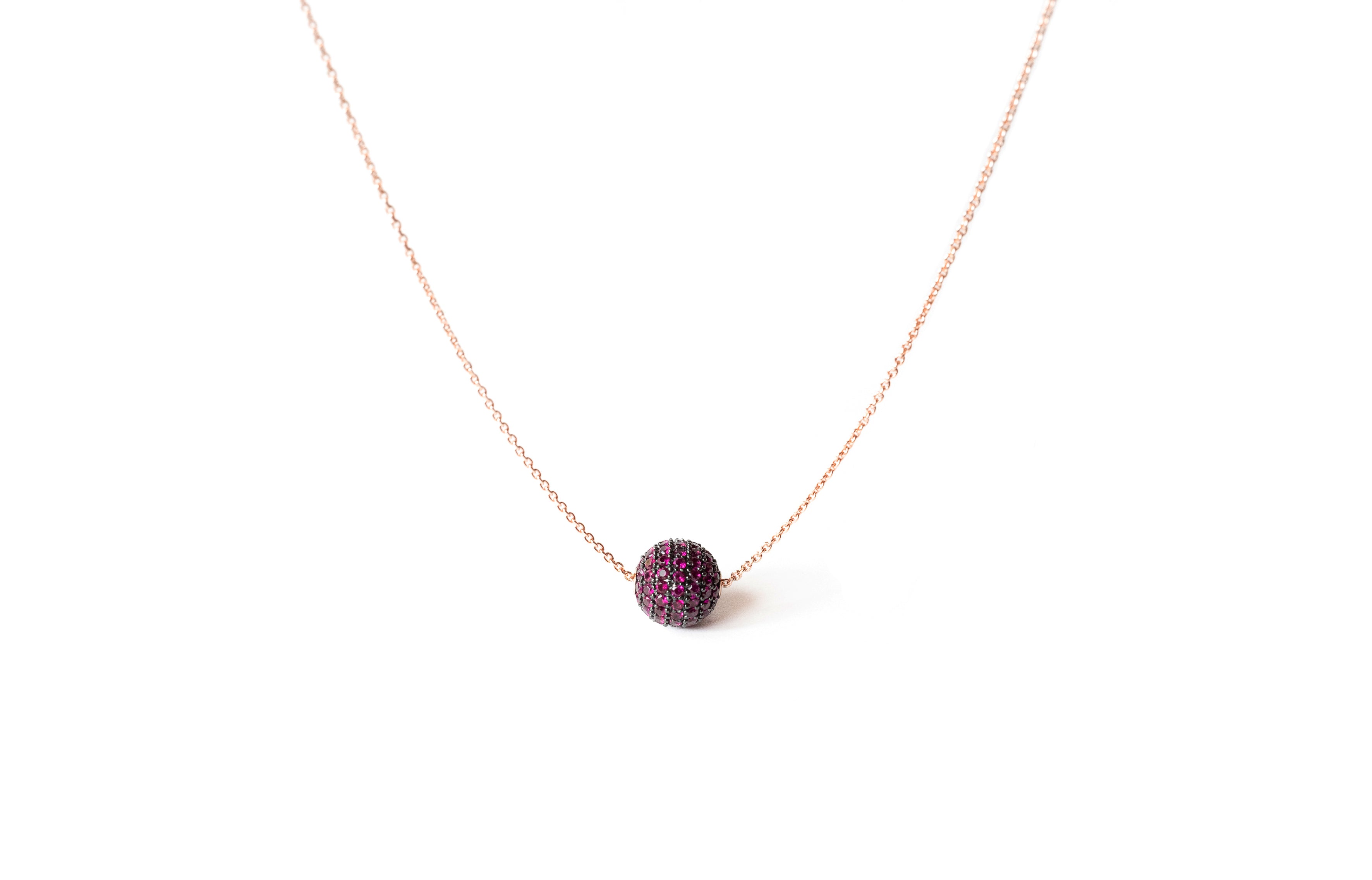 Collana a catena sottile con pallina pavè pendente in rubino sintetico, realizzata in argento 925 con galvanica rodio rosa e nero.