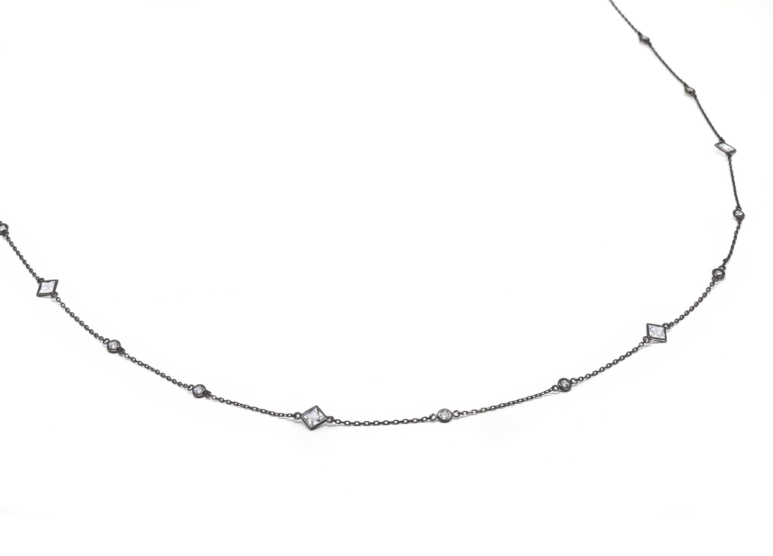 Collana lunga con pietre taglio carrè e tonde in zirconia cubica bianca, realizzata in argento 925 con galvanica rodio nero.