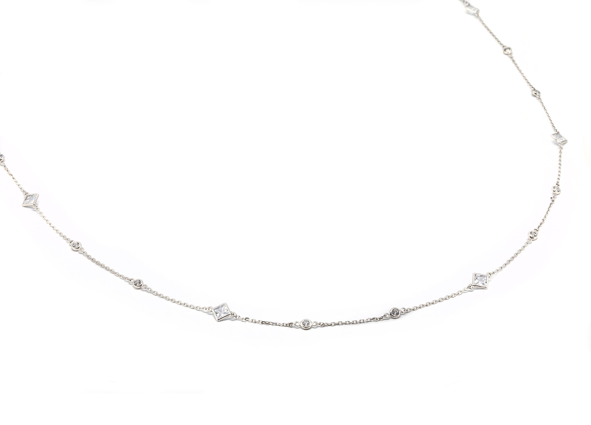 Collana lunga con pietre taglio carrè e tonde in zirconia cubica bianca, realizzata in argento 925 con galvanica rodio bianco.