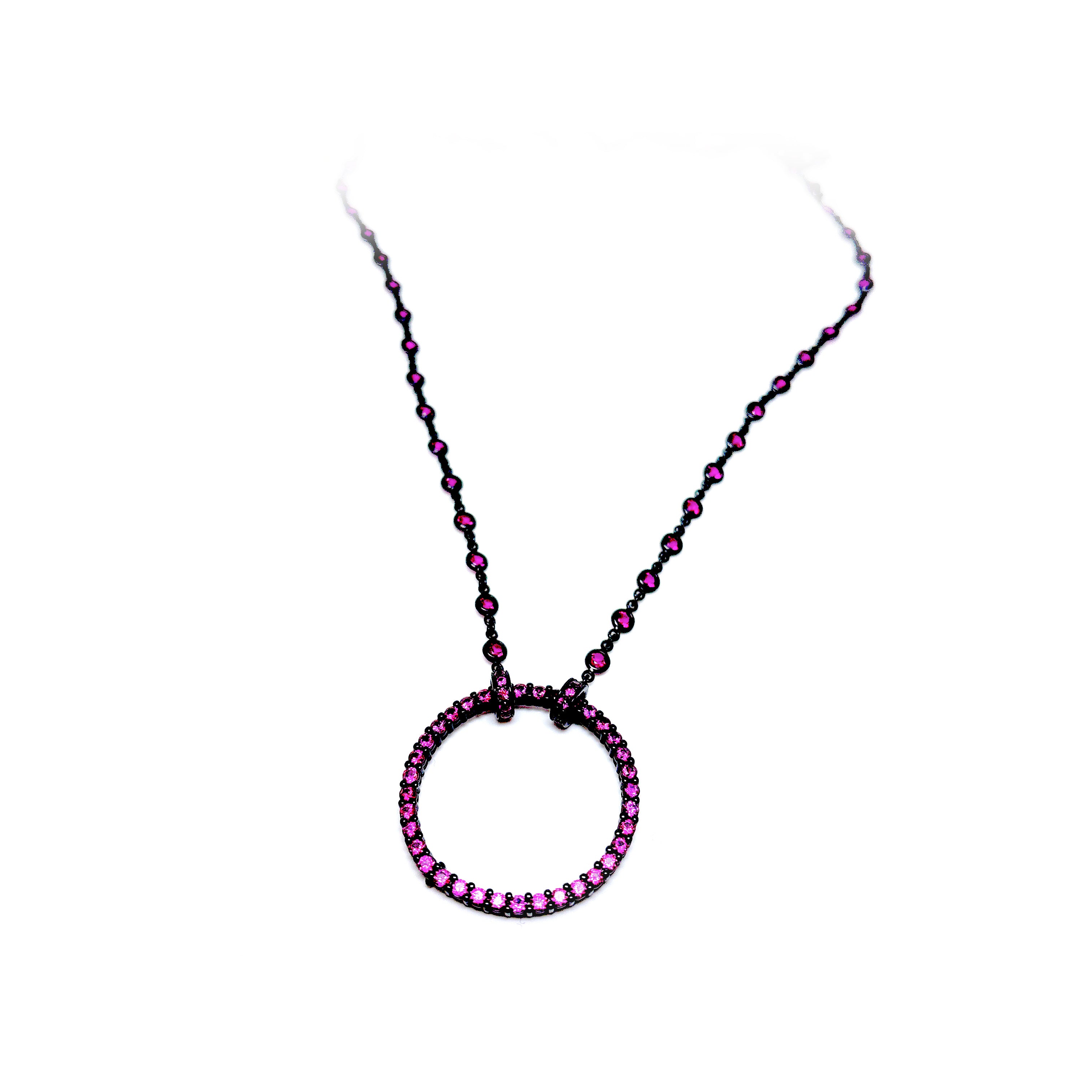 Collana lunga con piccole pietre tonde fitte in rubino sintetico e ciondolo tondo porta occhiali, realizzata in argento 925 con galvanica rodio nero.