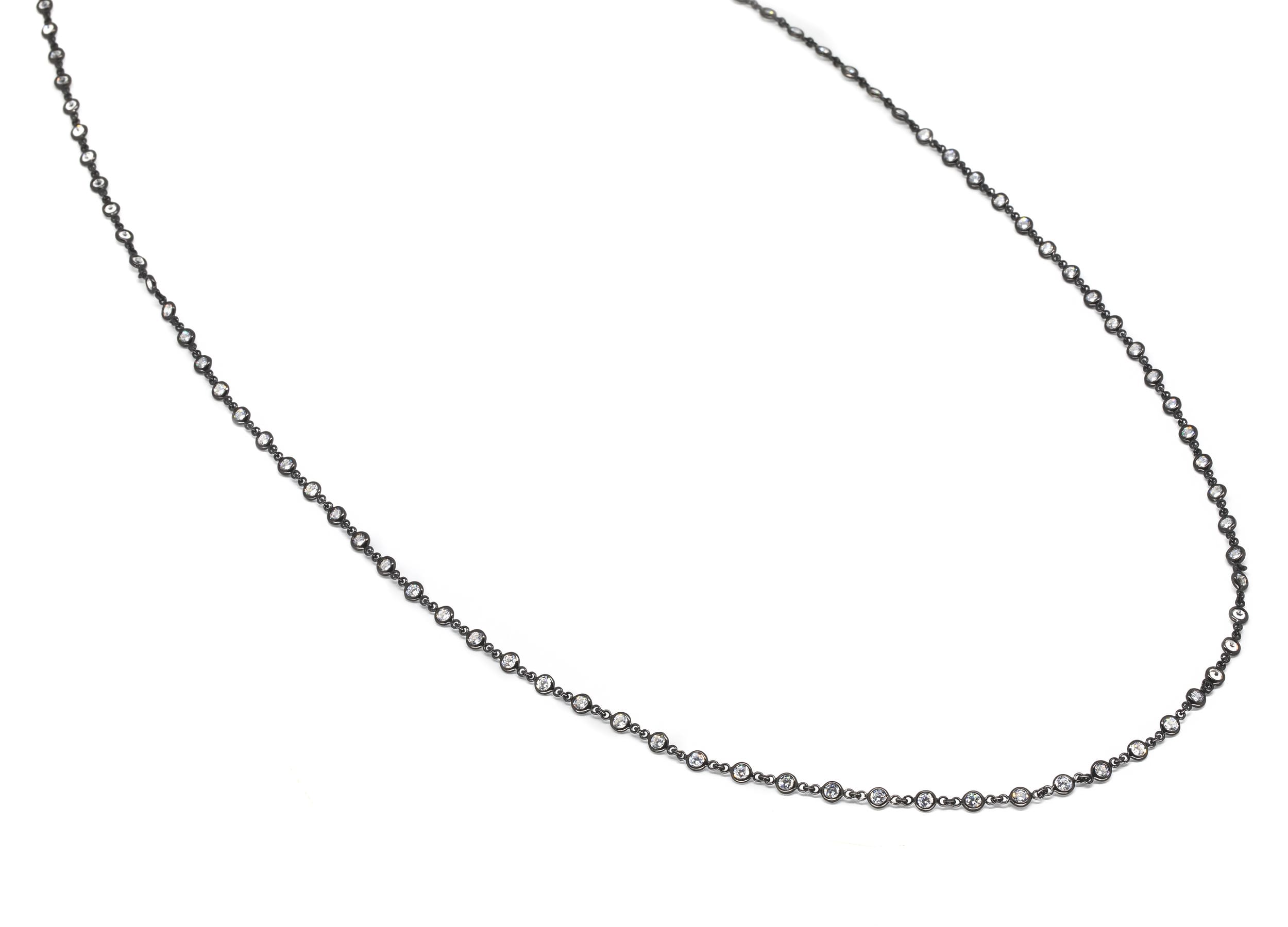 Collana lunga con piccole pietre tonde fitte in zirconia cubica bianca, realizzata in argento 925 con galvanica rodio nero.