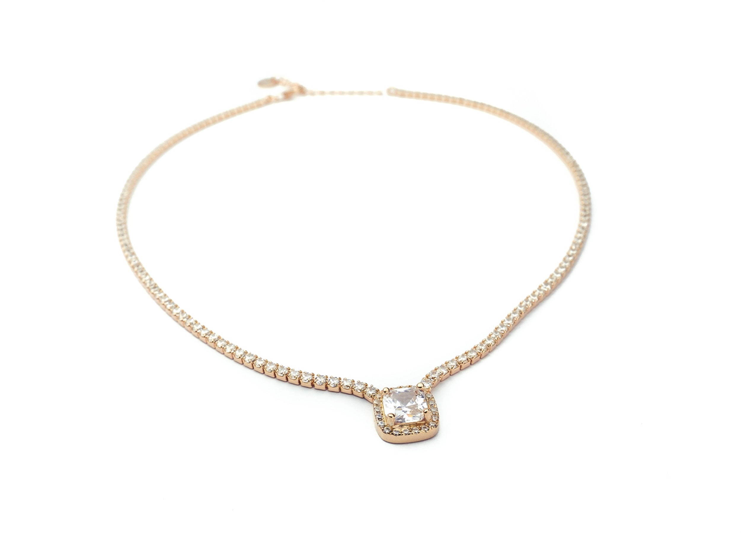 Girocollo tennis con bottone carrè centrale in zirconia cubica bianca, realizzato in argento 925 con galvanica rodio rosa.