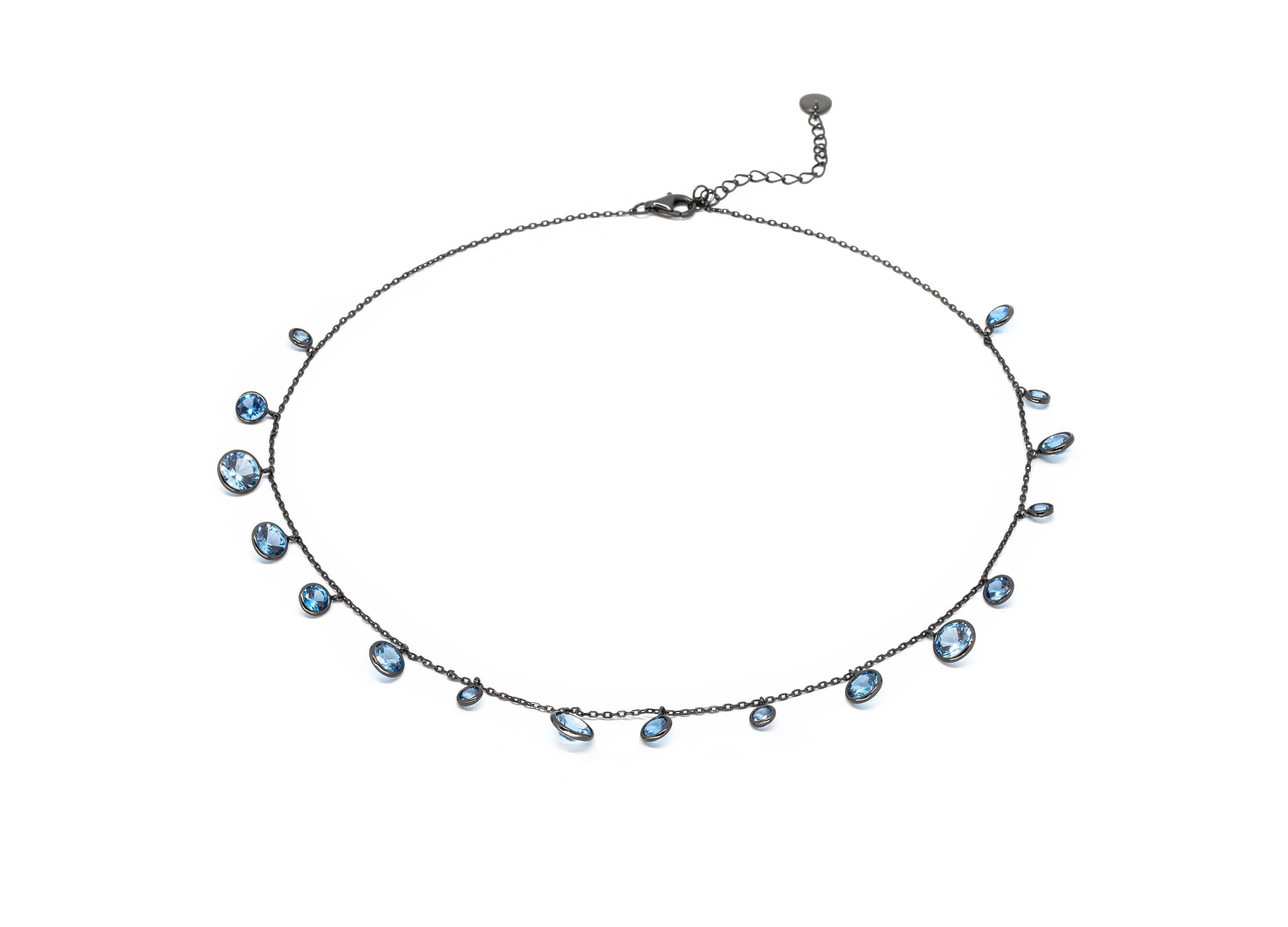 Girocollo con charms tondi e colorati in spinello sintetico azzurro di varie dimensioni, realizzato in argento 925 con galvanica rodio nero.