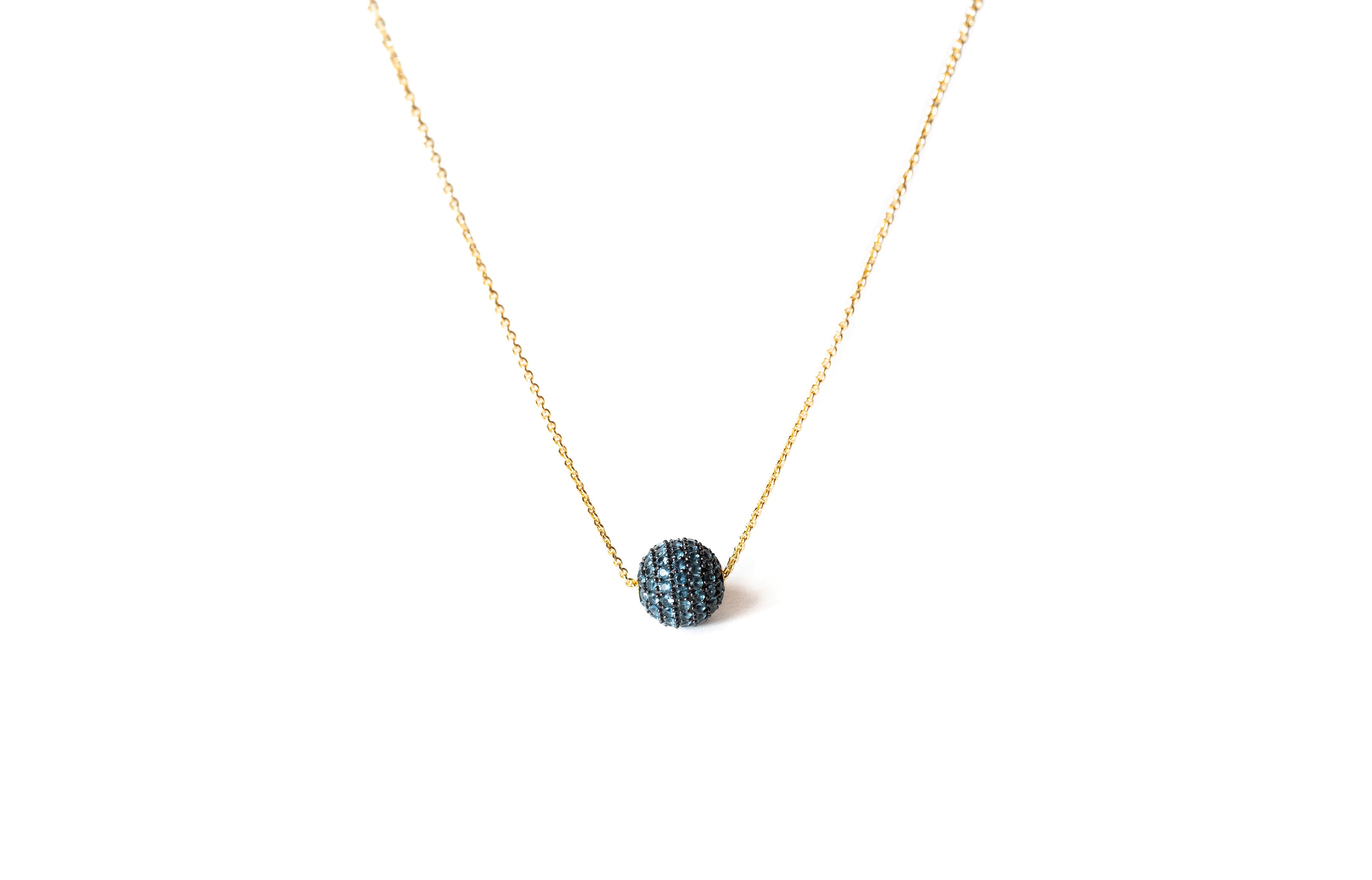 Collana a catena sottile con pallina pavè pendente in spinello sintetico aqua blue, realizzata in argento 925 con galvanica rodio giallo e nero.