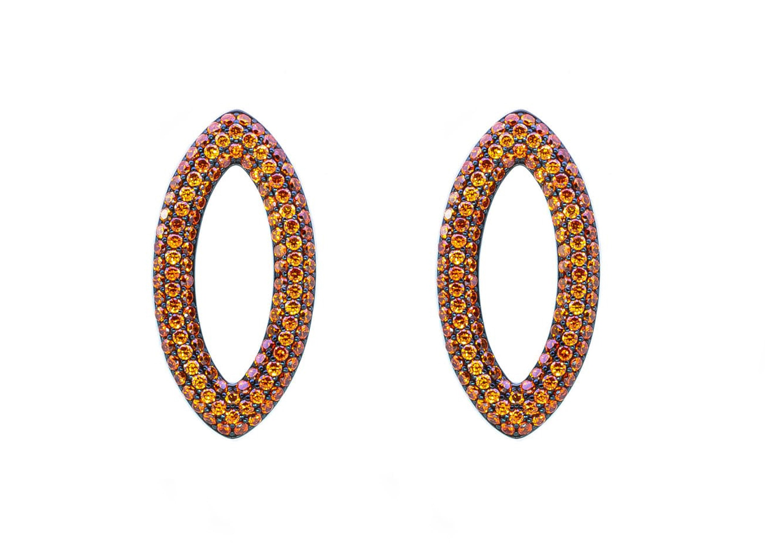Componenti per orecchini componibili con pavè zirconia cubica arancio, realizzati in Argento 925 con galvanica rodio nero ad alta resistenza.