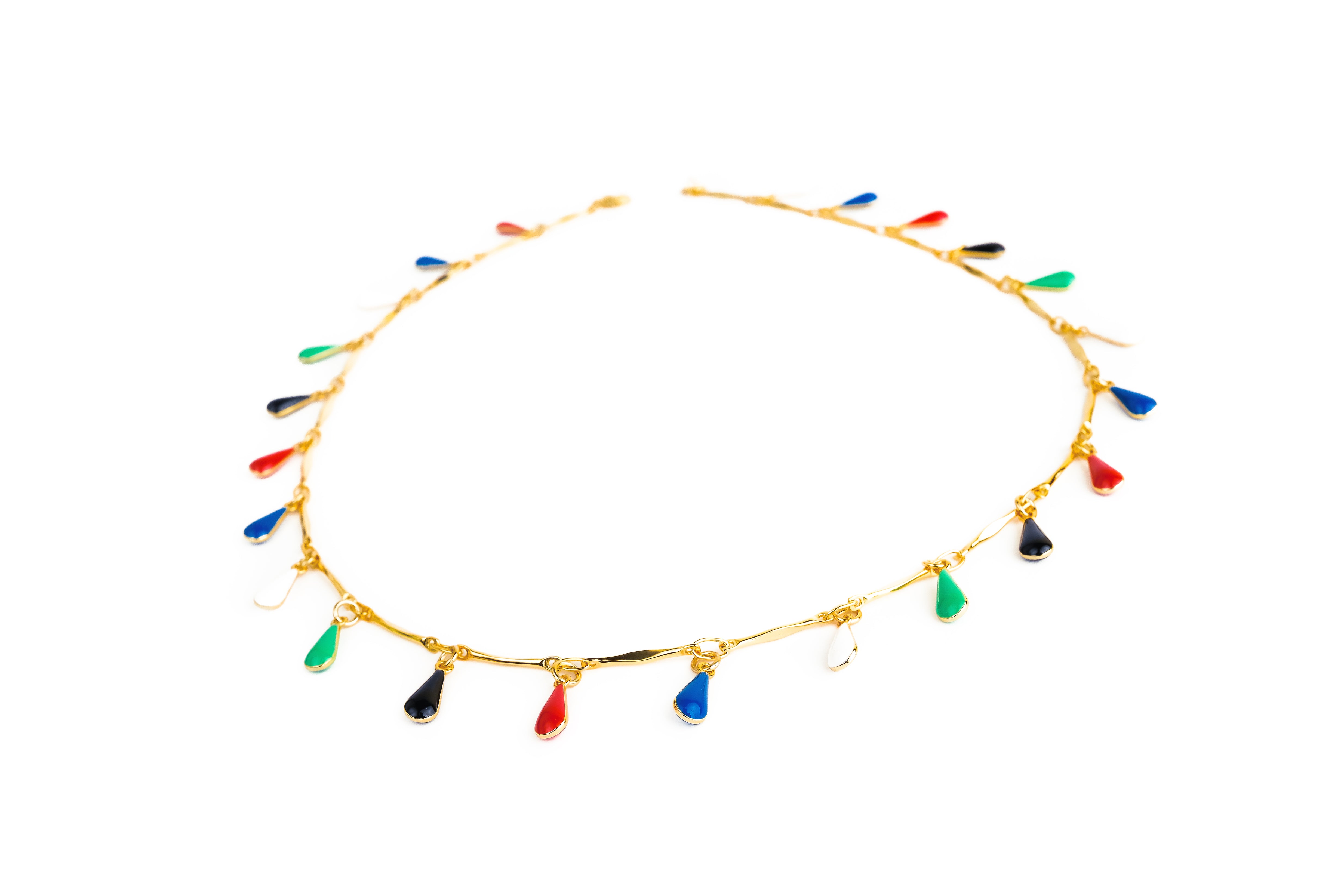 Girocollo catena a bastoncini con charms a goccia in smalto rosso, nero, verde, bianco e blu, realizzato in argento 925 con galvanica rodio giallo.
