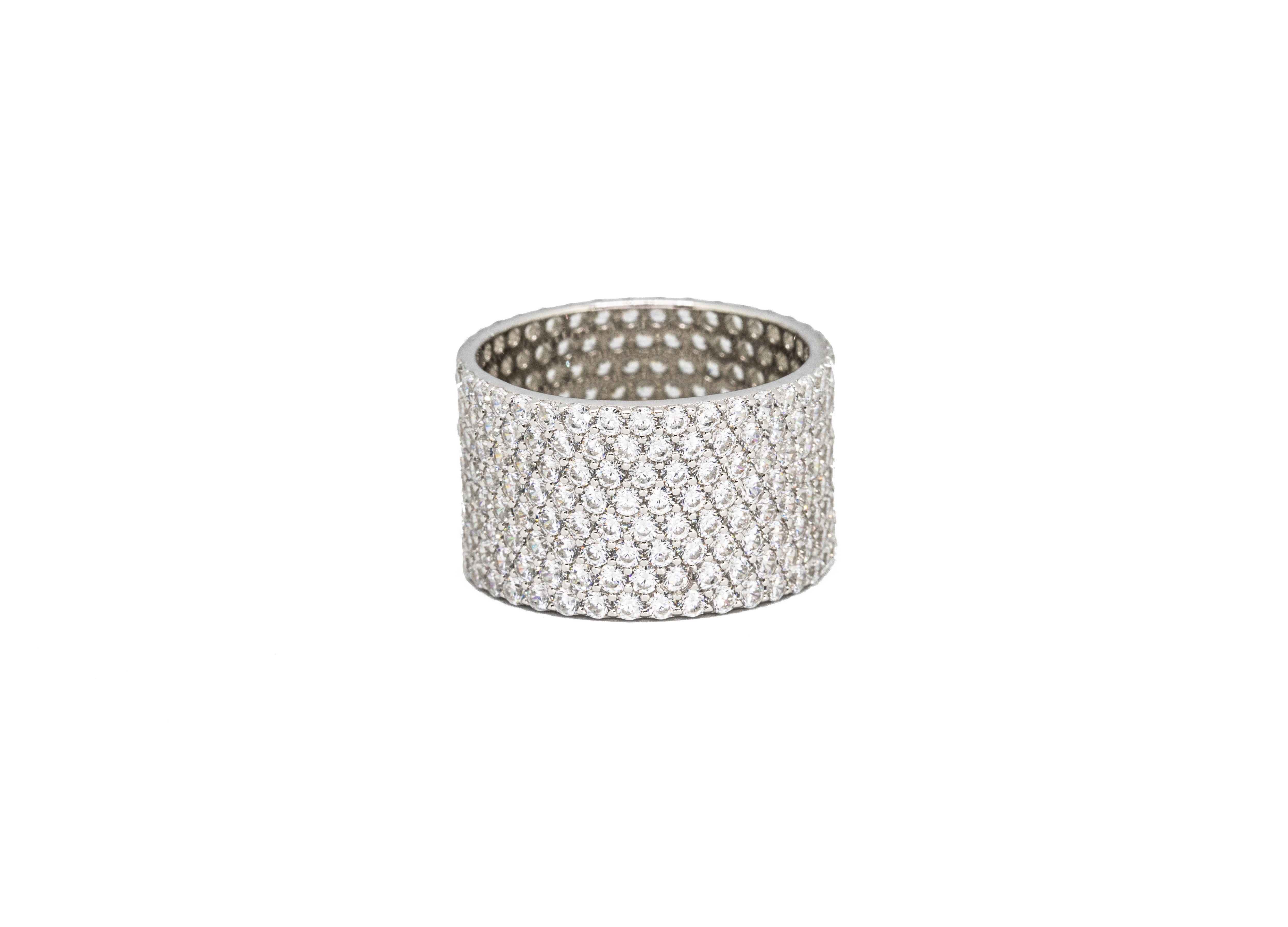 Anello a fascia realizzato in argento 925 con galvanica rodio bianco ad alta resistenza impreziosito da un brillante pavè in zirconia cubica bianca.