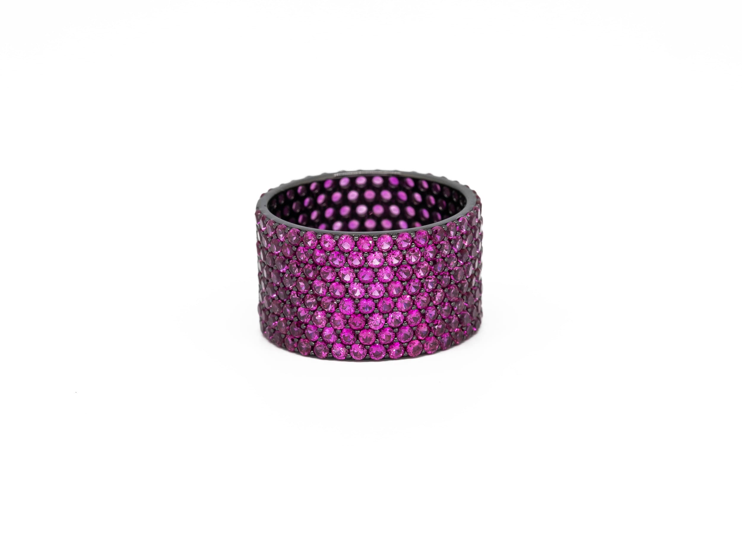 Anello a fascia realizzato in argento 925 con galvanica rodio nero ad alta resistenza impreziosito da un coloratissimo pavè in rubino sintetico.