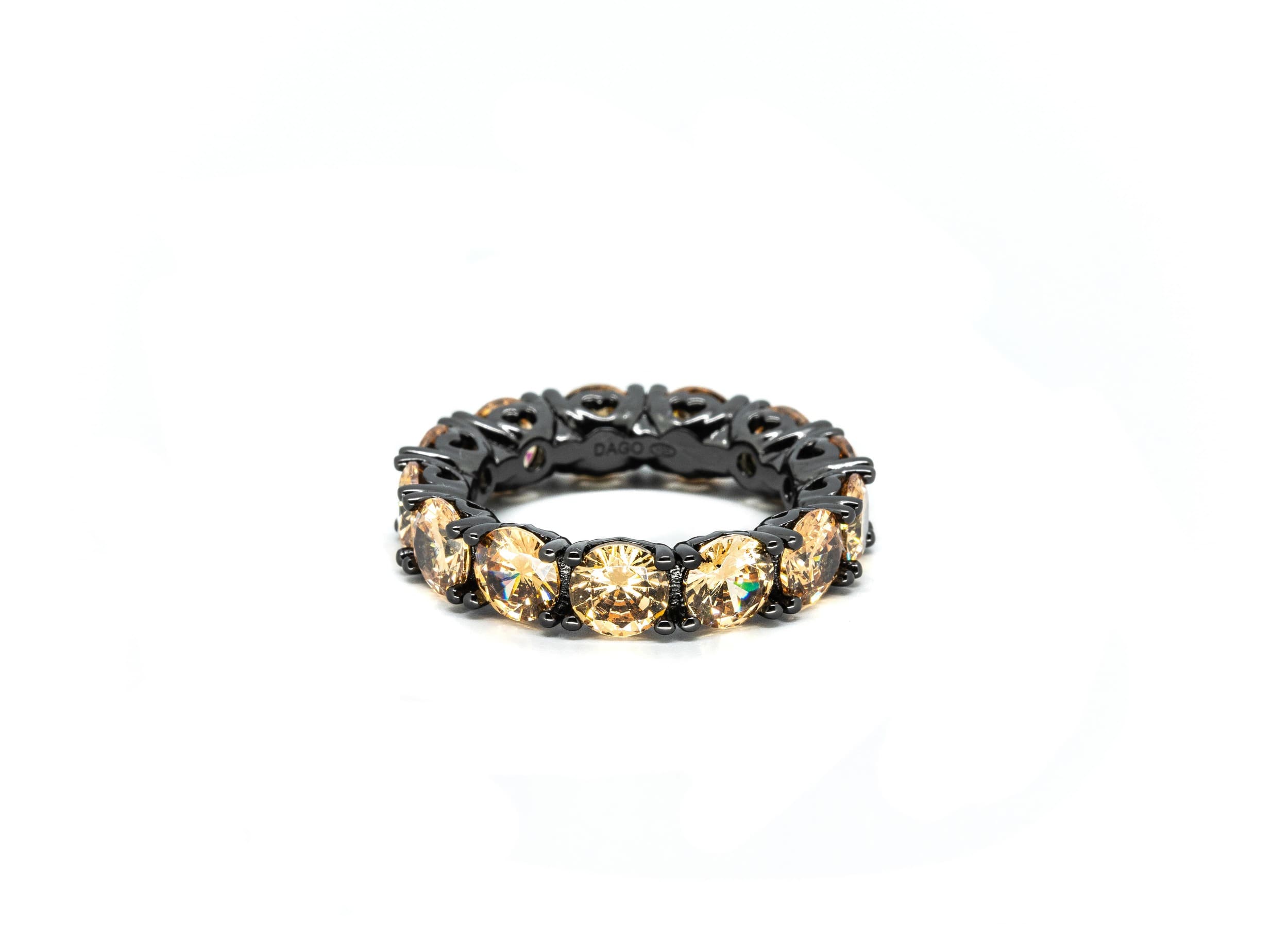 Fedina realizzata in argento 925 con galvanica rodio nero impreziosita da coloratissimi zirconi tondi champagne e galleria a cuore.
