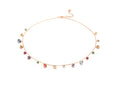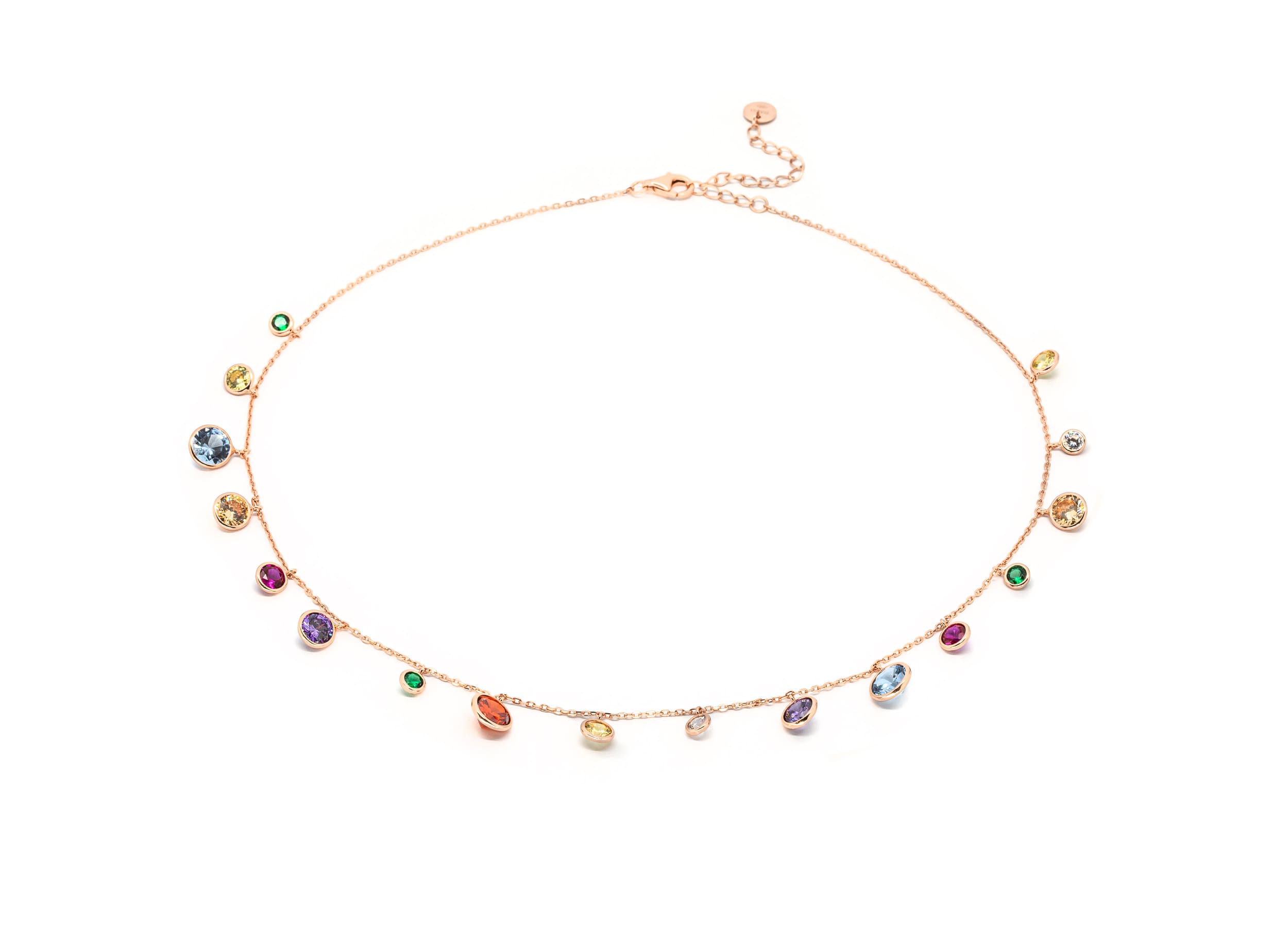 Girocollo con charms tondi e colorati in zirconia cubica gialla, arancio, bianca, champagne e ametista, nano crystal verde, rubino sintetico e spinello sintetico azzurro di varie dimensioni, realizzato in argento 925 con galvanica rodio rosa.