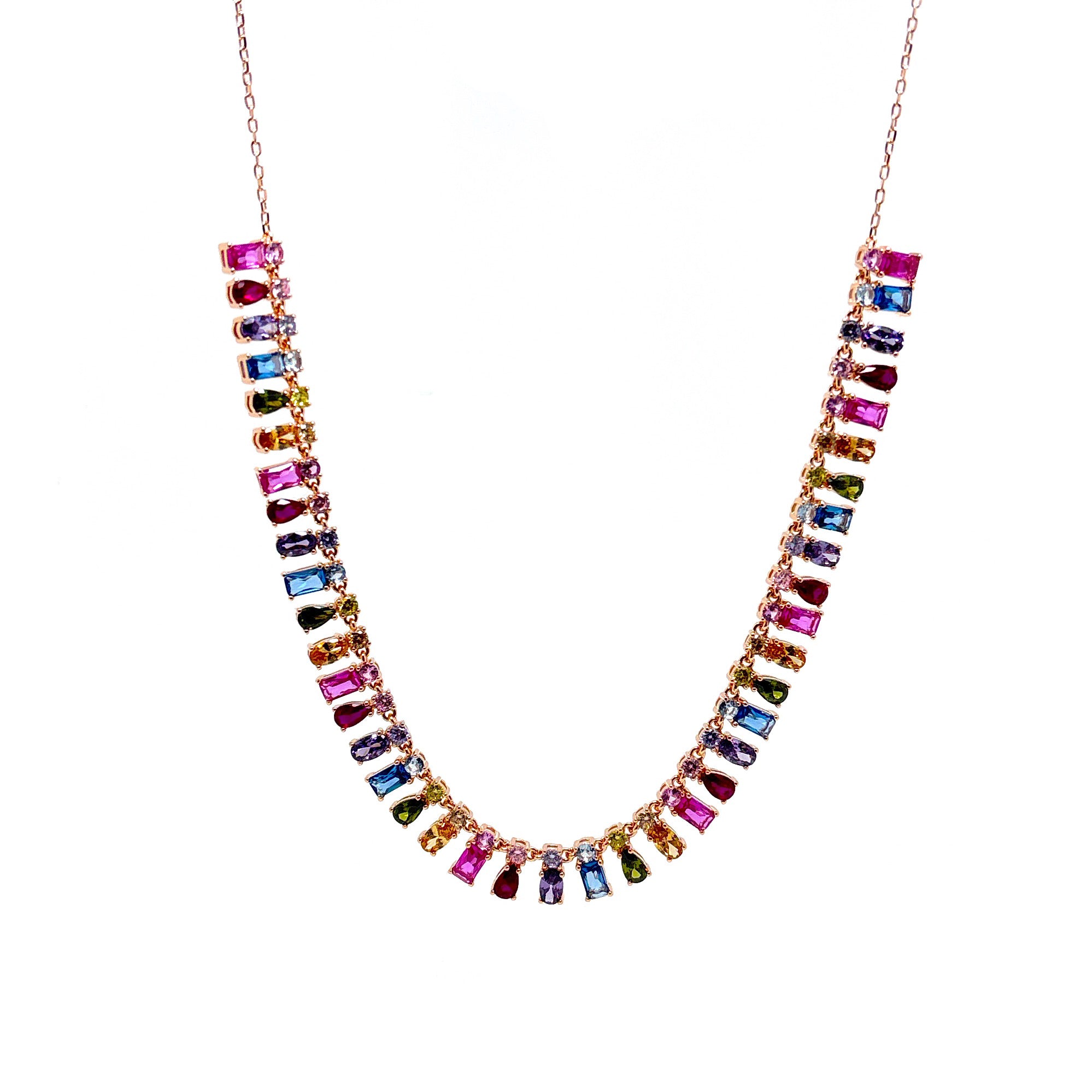 Girocollo con charms mix tondi, taglio baguettes, ovale e goccia colorati in zirconia cubica gialla, arancio, bianca, champagne e ametista, nano crystal verde, rubino sintetico e spinello sintetico azzurro, realizzato in argento 925 con galvanica rodio rosa.