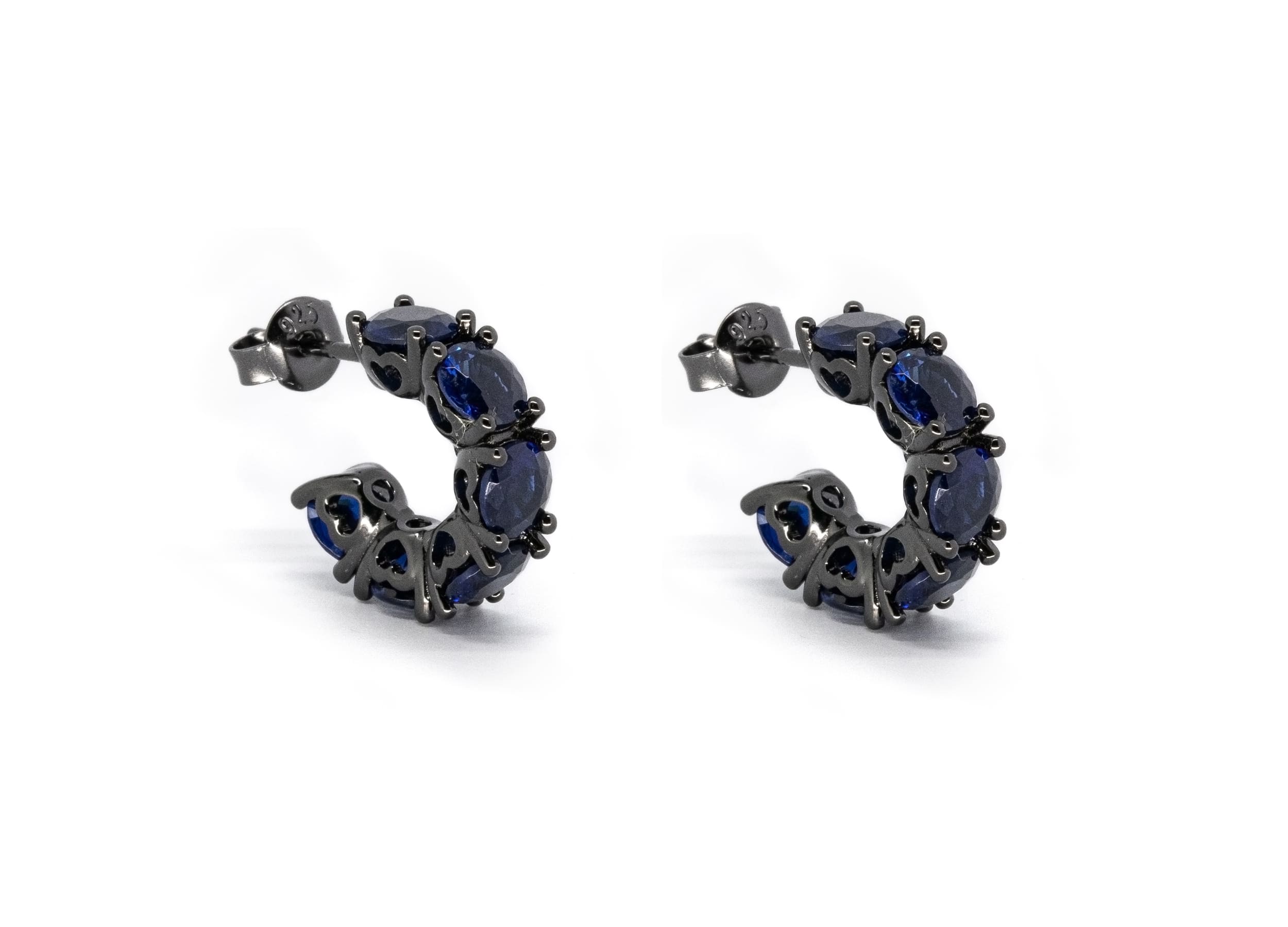 Orecchini a lobo con pietre tonde in nano crystal blu zaffiro e galleria a cuori, realizzati in Argento 925 con galvanica rodio nero ad alta resistenza.