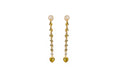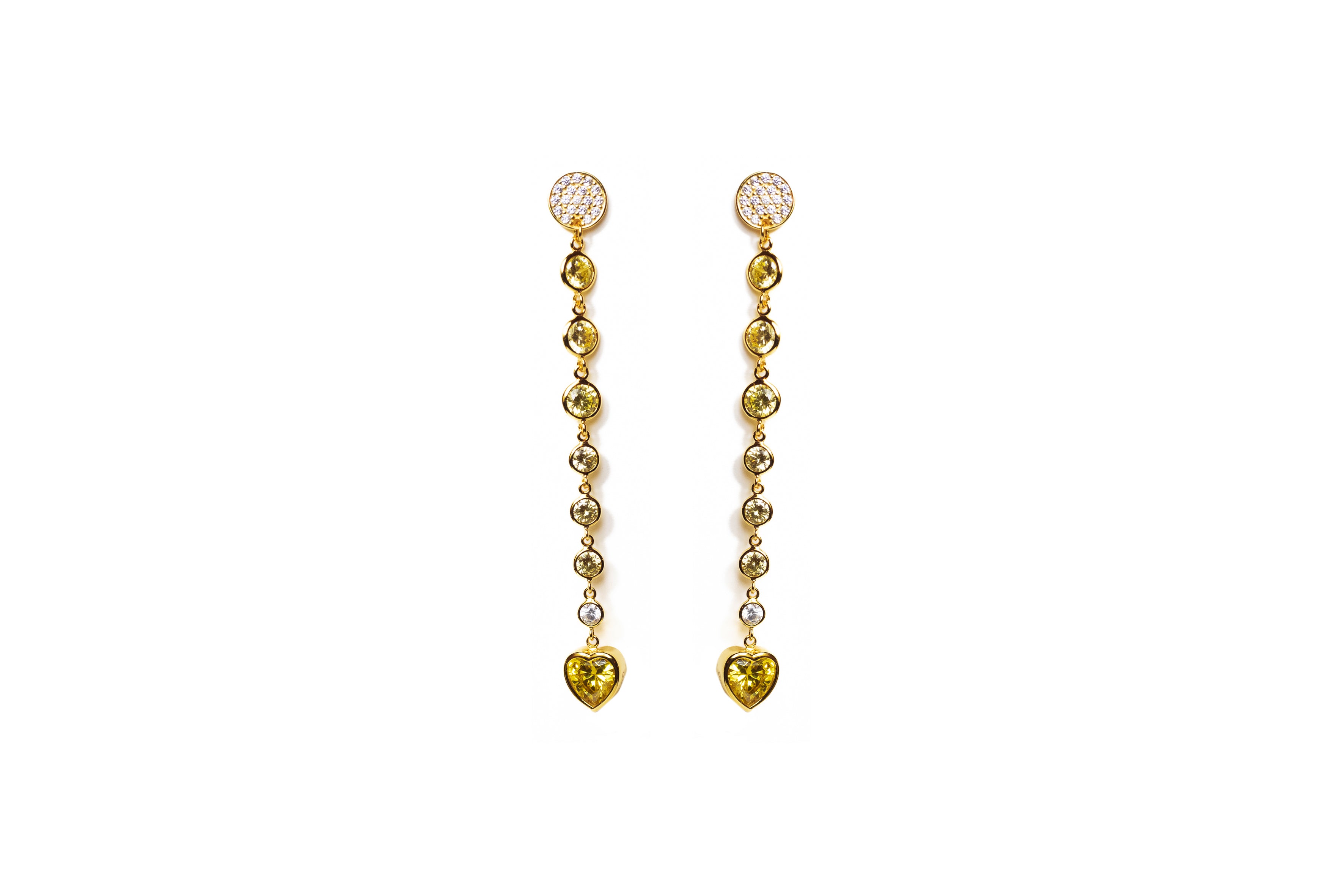 Orecchini pendenti con pietre tonde di dimensioni a scalare e cuore finale in zirconia cubica gialla e bianca, realizzati in Argento 925 con galvanica rodio giallo ad alta resistenza.